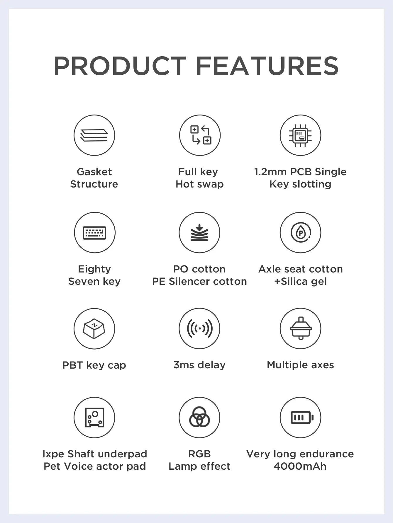 - Gasket structure with PCB single-key slotting and 5-layer dampening for a solid feel