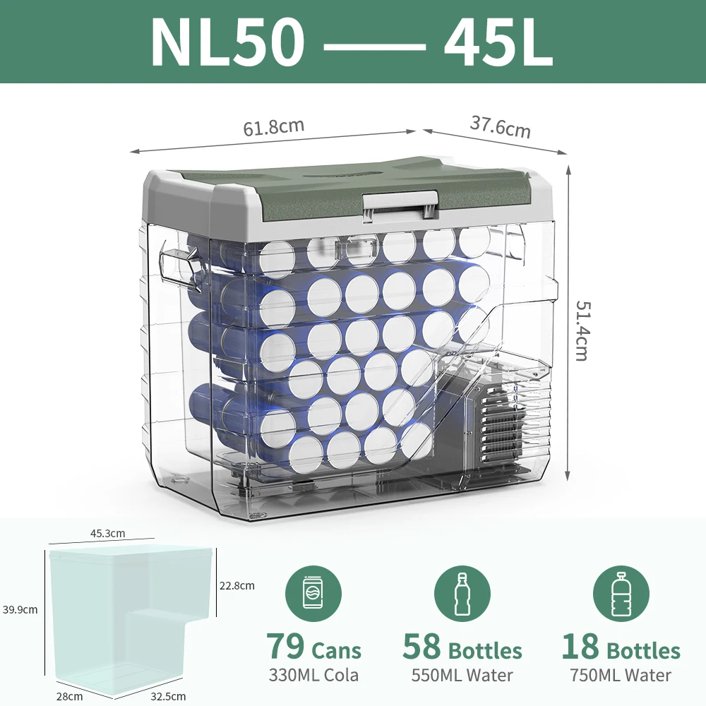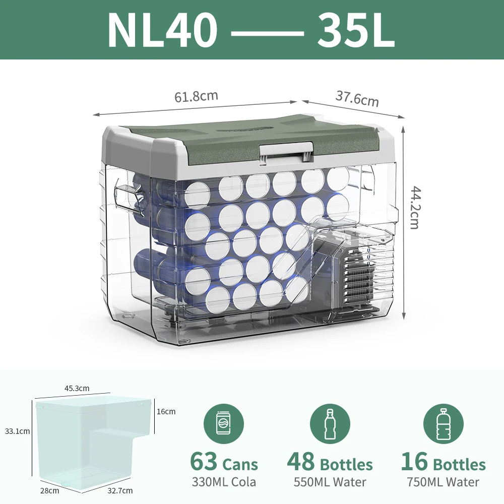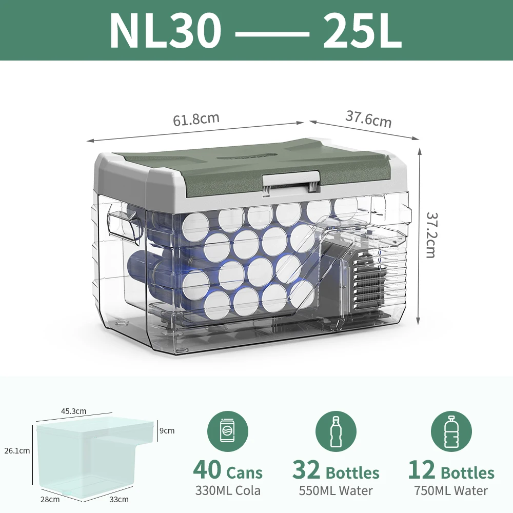 With the 25L/35L/45L optional of large storage space. This car fridge serves as a refrigerator or a freezer. You can easily adjust the temperature as you want, no ice needed! You can keep a variety of foods fresh on the go. Perfect for use in SUVs, RVs, campers, and even yachts, offering convenience wherever your adventures take you. NL30—25L, NL40—35L, NL50—45L (Model names are not related to actual capacity)