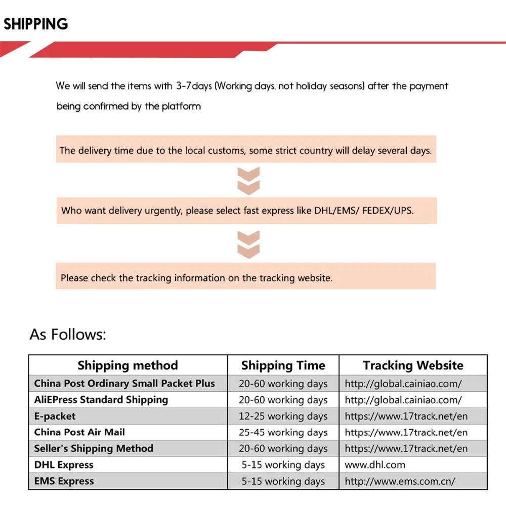 To keep the cost of our products low and pass the savings on to you, we ship a majority of our products directly from our warehouses located in USA, China, Germany, Russian Federation and European. Under usual circumstances, total delivery time is 9-21 days depending on your location (excluding processing times).