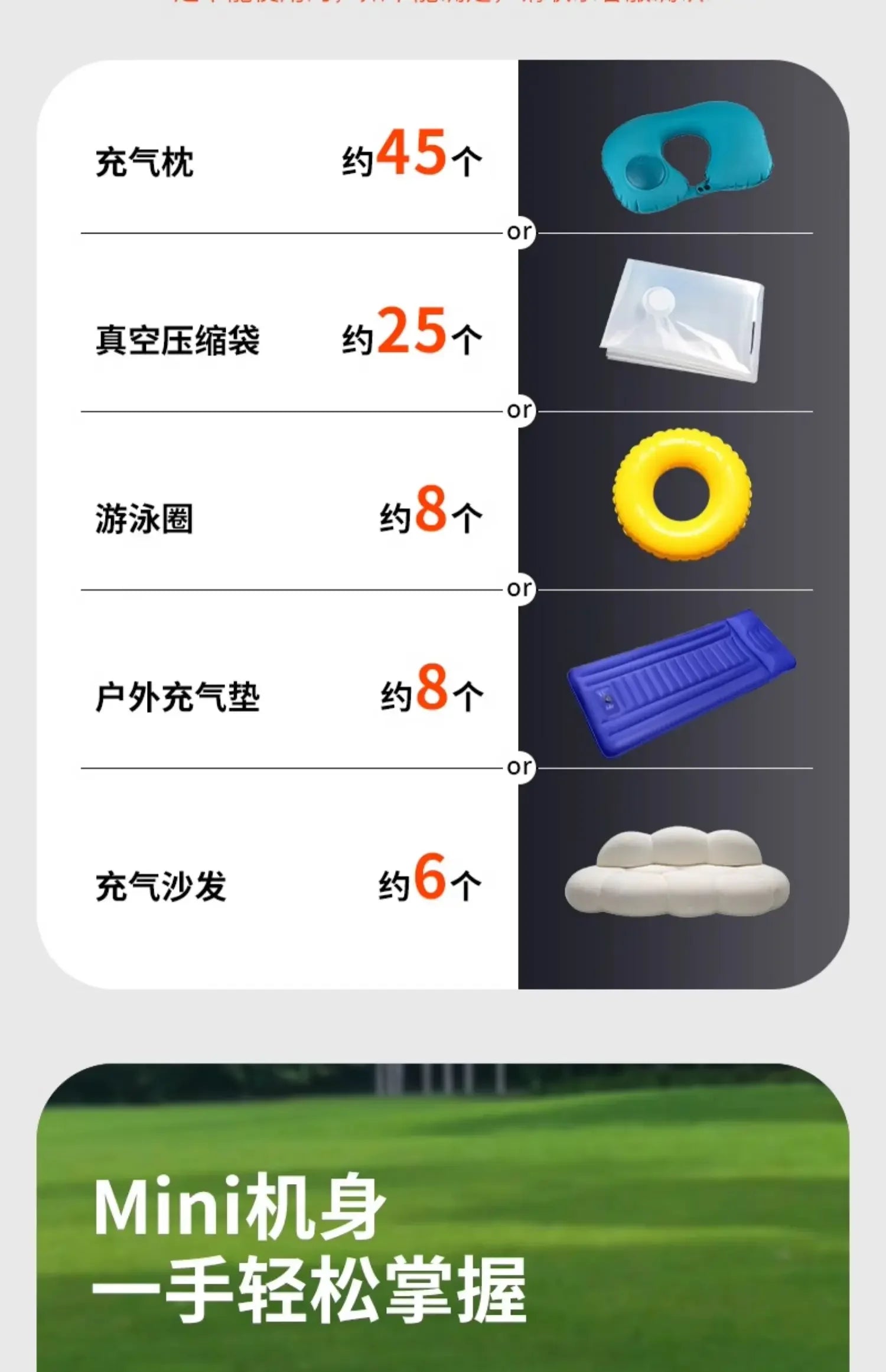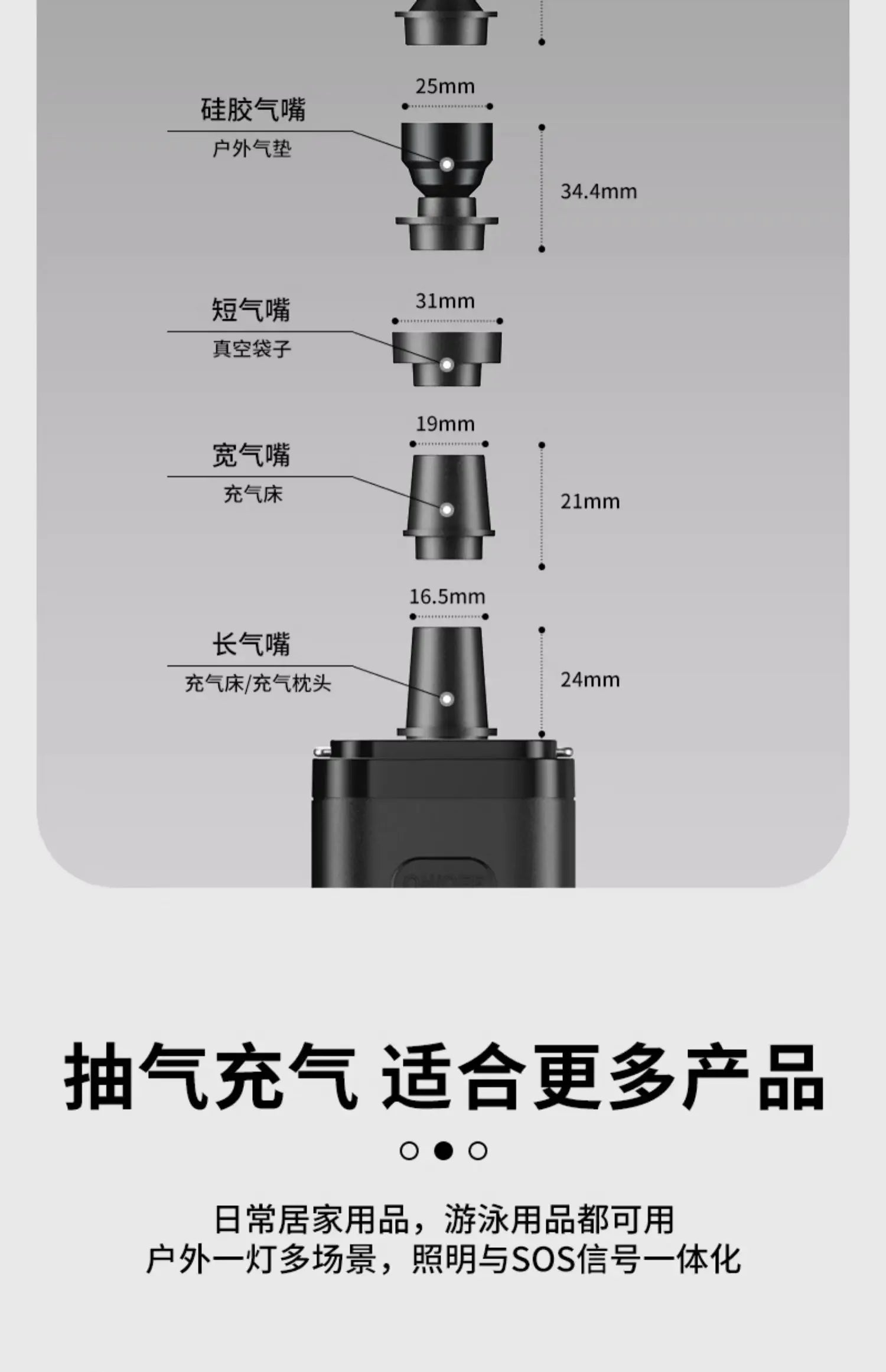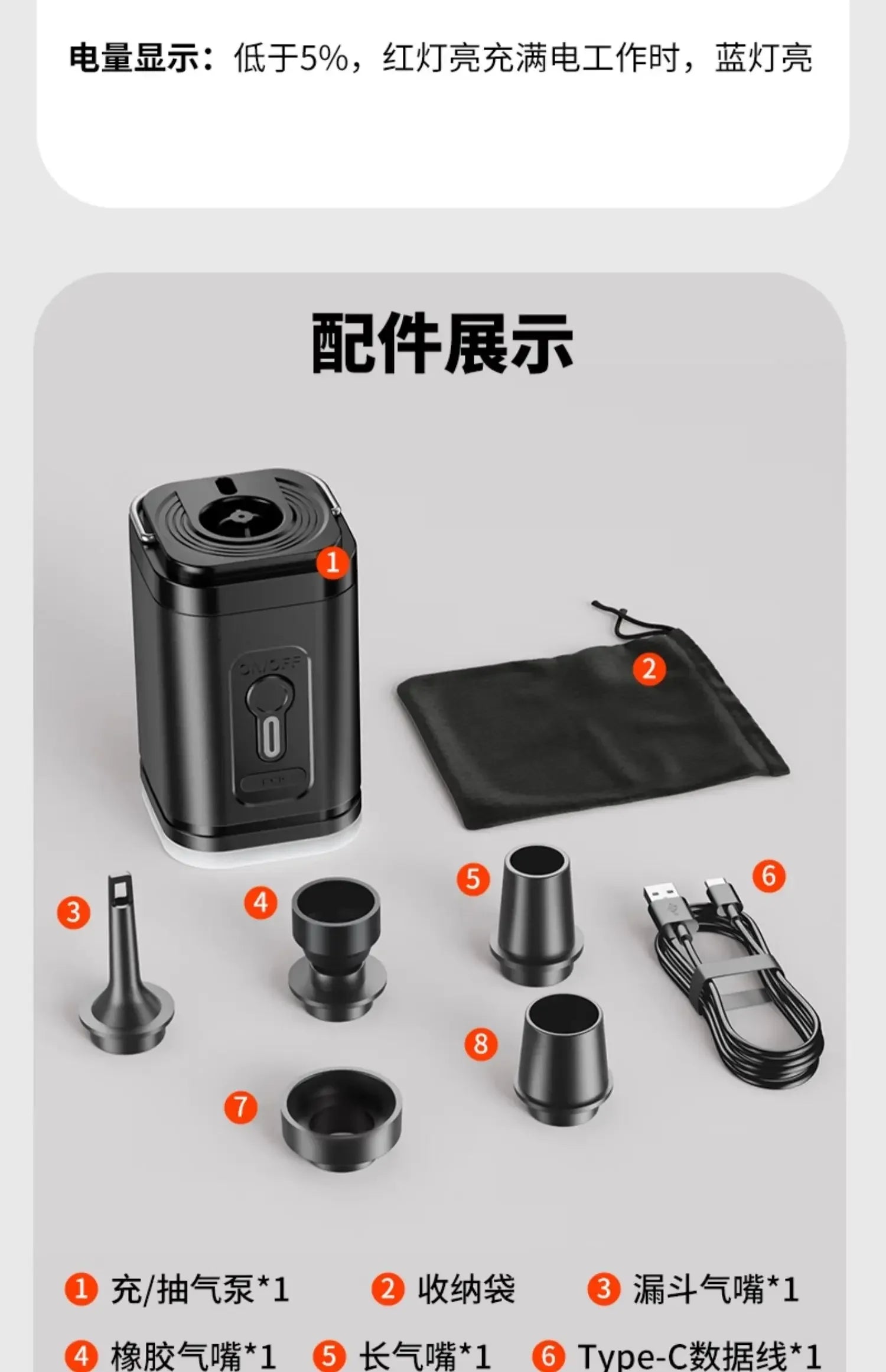 - Included accessories: 6 nozzles for various inflatables, Type-C cable, and storage bag.