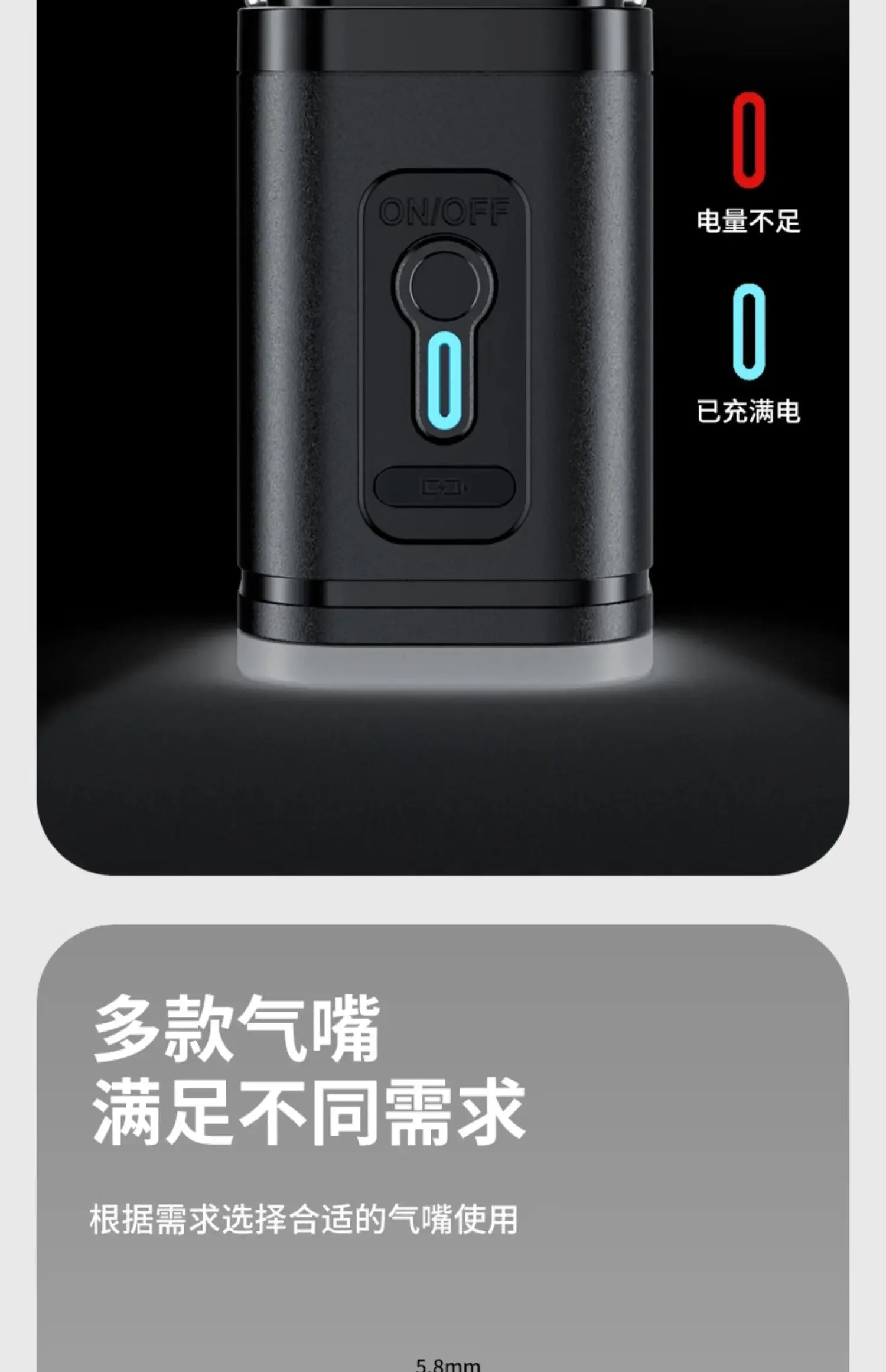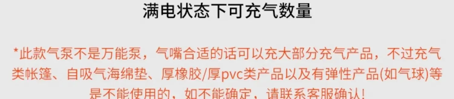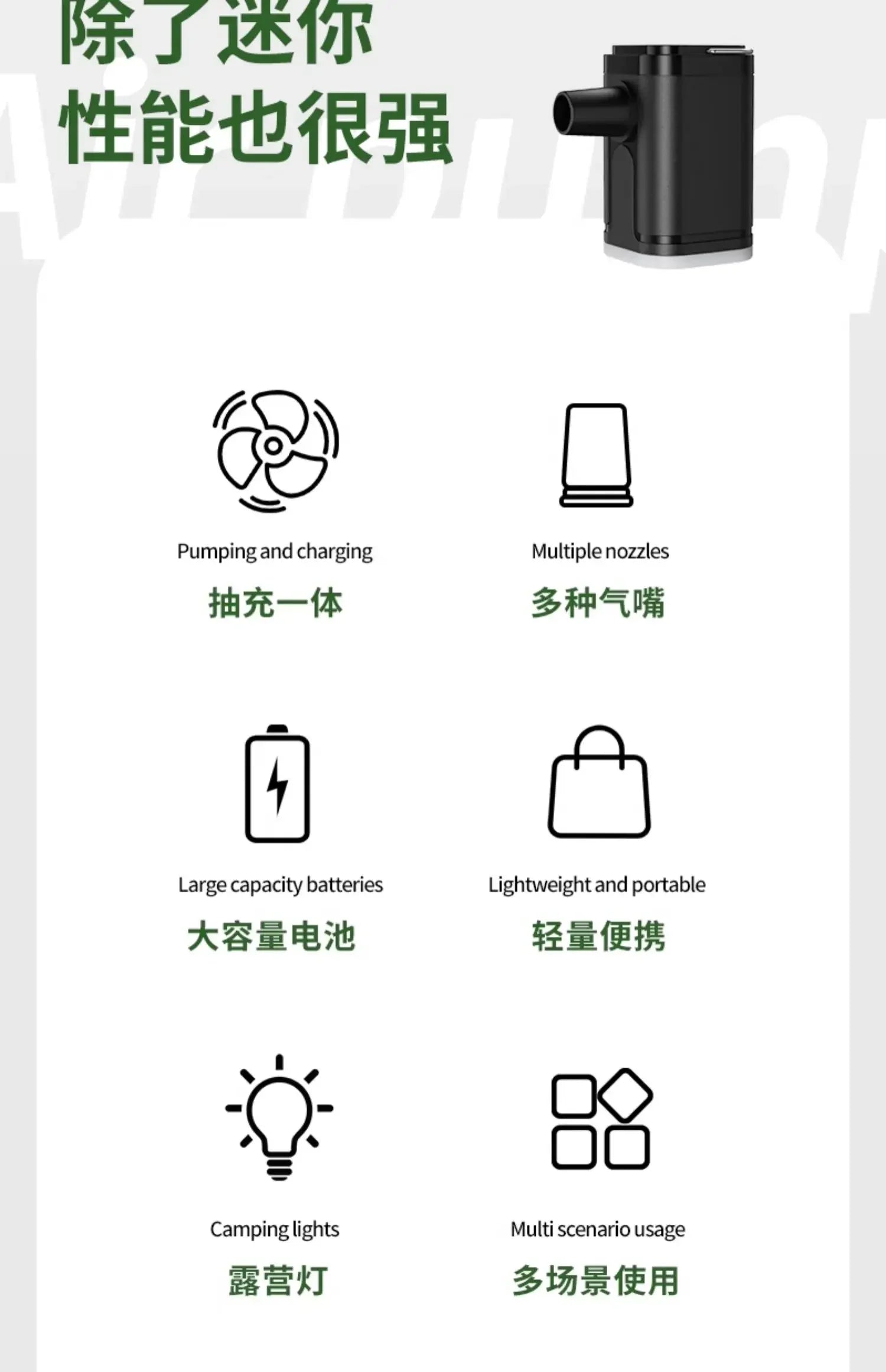 - Included accessories: 6 nozzles for various inflatables, Type-C cable, and storage bag.