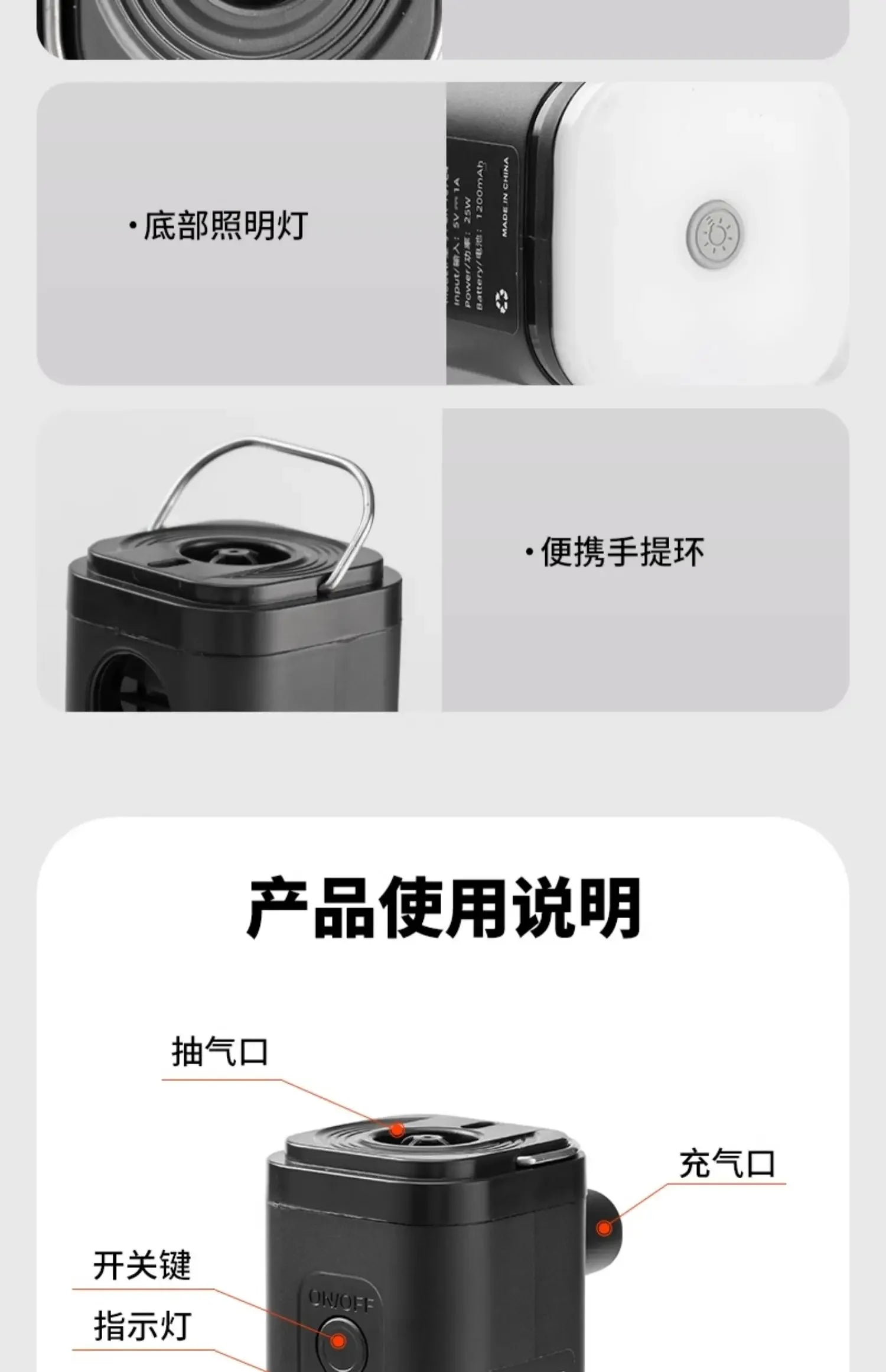 Performance metrics show practical versatility: a lab-tested 1200mAh battery delivers enough power to inflate 8 airbeds per charge, roughly doubling the runtime of many comparable pumps. The device supports up to 20 PSI, making it suitable for car tires and household inflatables, while staying quiet at under 65 dB. Deflate mode saves up to 50% of storage space when packing vacuum-sealed bags, and the integrated camping light (Normal/High/SOS) adds emergency visibility on outdoor trips. Charging completes in 2–3 hours, ensuring you’re ready for your next adventure quickly.