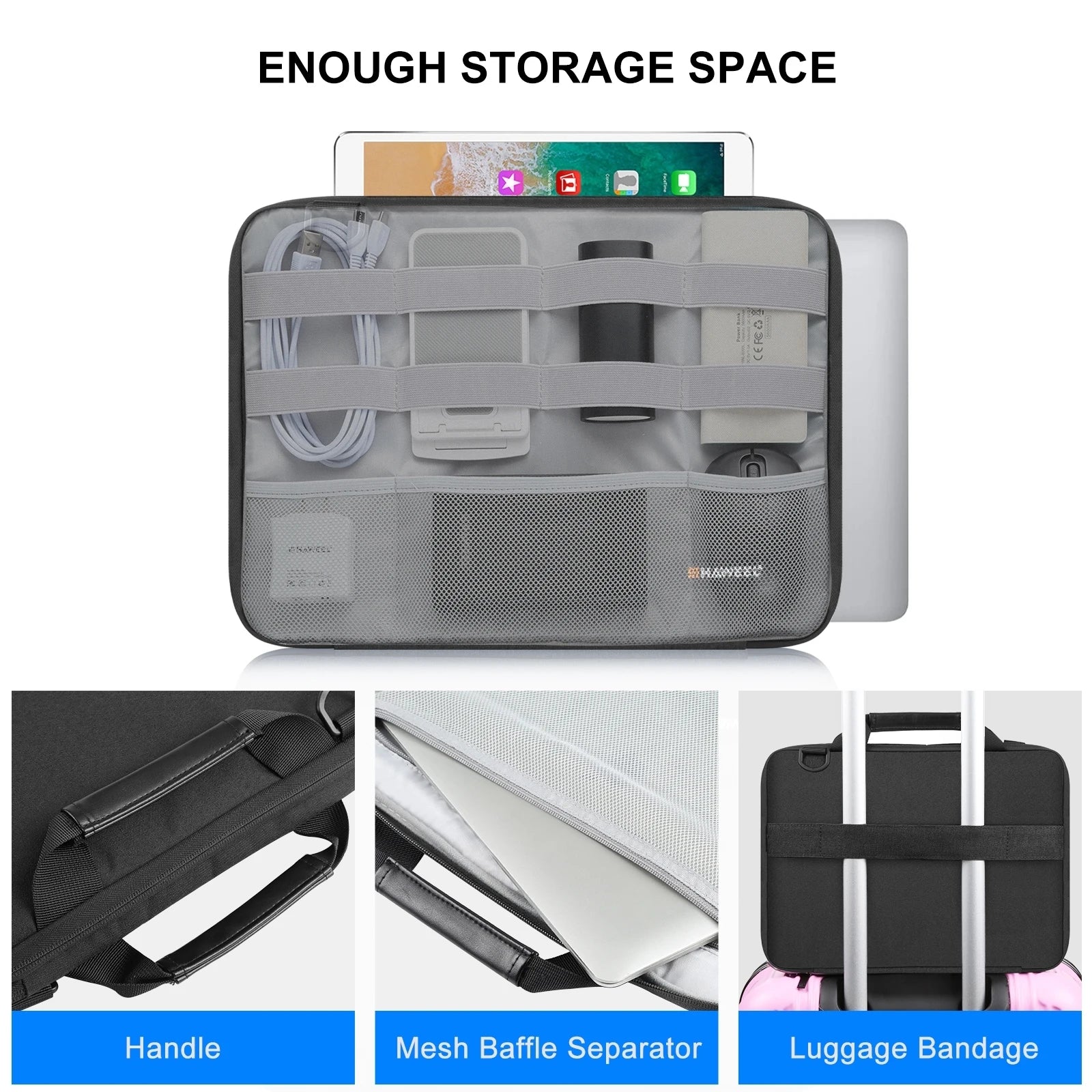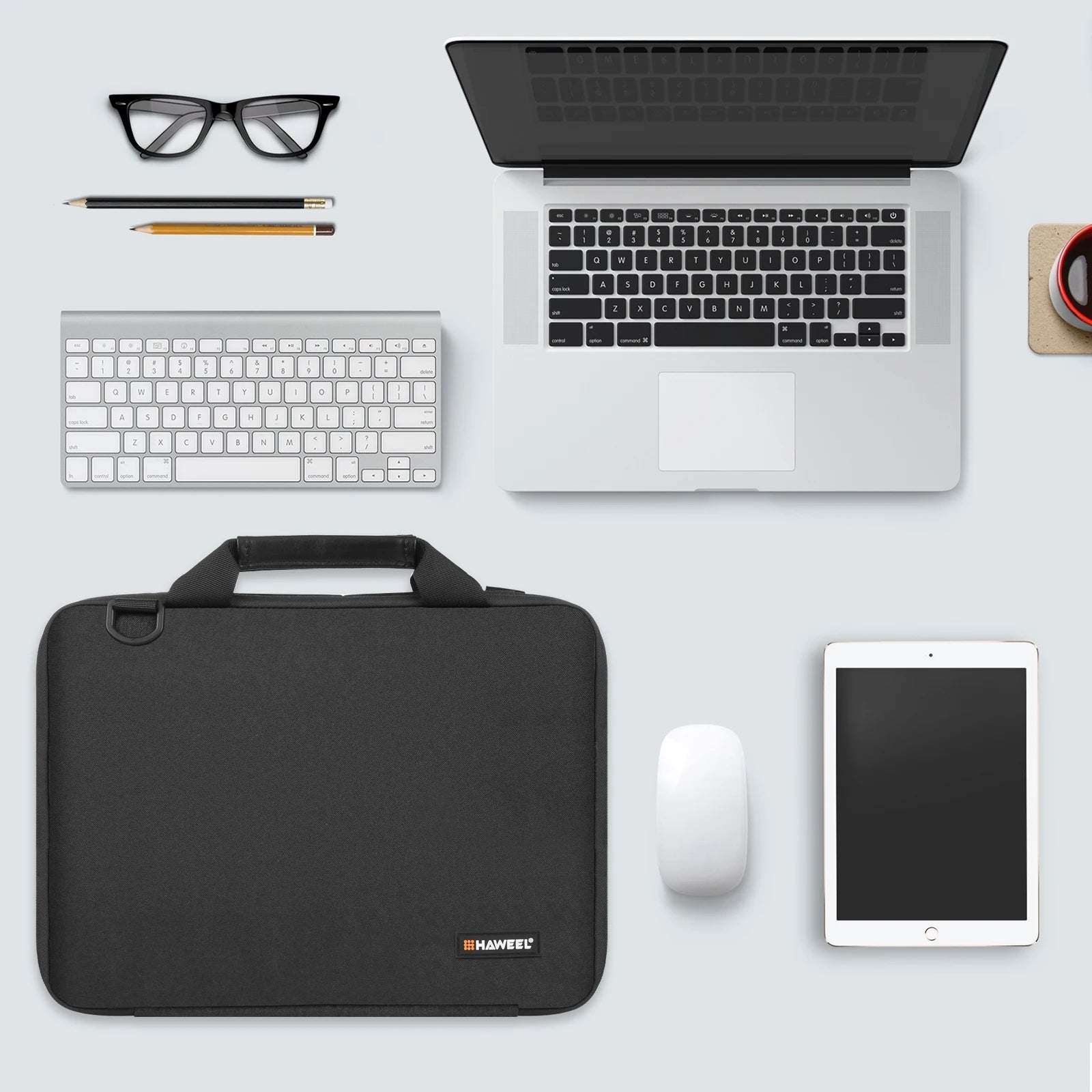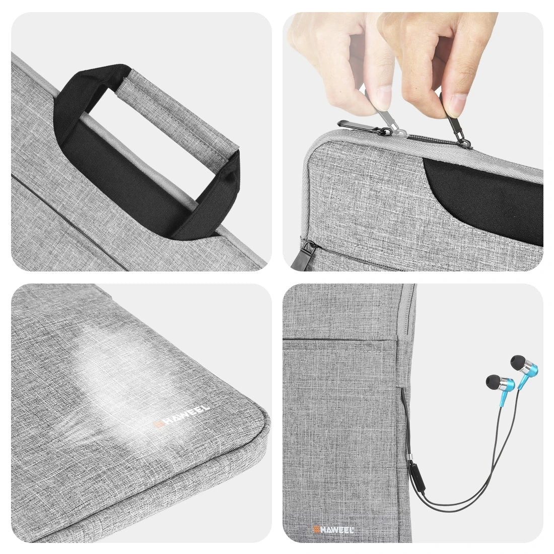 The two size options yield different internal volumes: the 13-14 inch model offers about 2,822 cm³, while the 14-16 inch model offers about 3,540 cm³. This represents roughly a 25% increase in internal space for the larger size, enabling a 14-16 inch laptop plus essential accessories such as a wallet, phone, data cable, and mouse with ample room to spare. Both sizes maintain a slim 3 cm thickness, preserving a compact profile for everyday carry. The exterior uses water-repellent fabric, and the interior combines velvet, pearl cotton, nylon, spandex, PC material, and a PU handle to deliver multi-layer protection against dust, water, scratches, or shocks during daily use or travel.