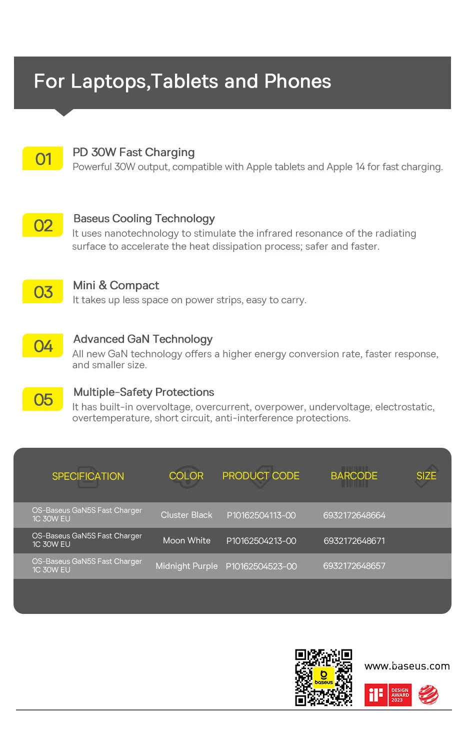 - Output Profiles: 5V/3A (15W), 9V/3A (27W), 12V/2.5A (30W), 15V/2A (30W), 20V/1.5A (30W)