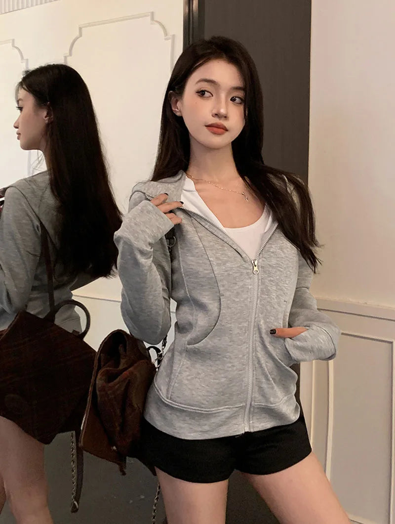 Discover a versatile gray zipper hooded sweatshirt designed for women that combines a sleek, Korean-inspired slim-fit silhouette with practical warmth. This zip-up hoodie delivers a flattering, modern shape while keeping you cozy through autumn and winter. Built with a durable polyester exterior and a cotton-lined interior, it offers warmth without bulk, so you stay comfortable during long days of activity or casual outings. The solid color makes styling effortless, effortlessly pairing with leggings, jeans, or athleisure staples for a polished, everyday look.