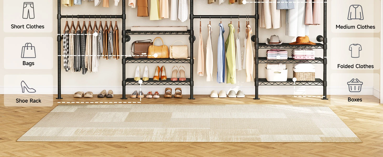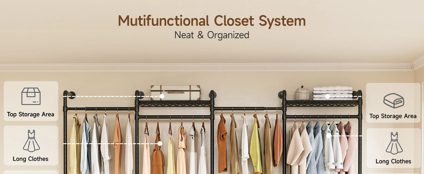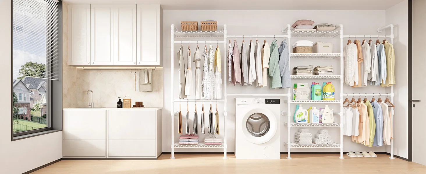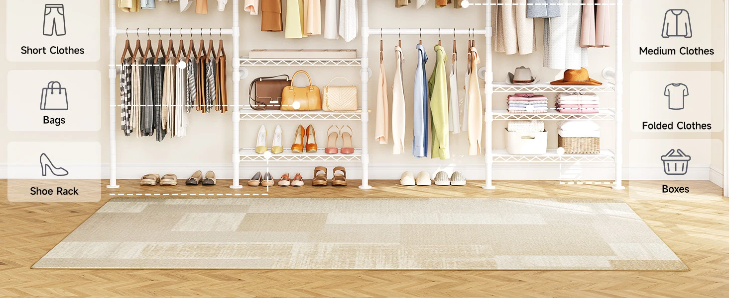 Perfect for storage versatility! Use this sturdy closet rack in bedrooms, living rooms, laundry areas, stores, or bathrooms. From daily essentials to retail displays, it's the ultimate storage workhorse for any space.