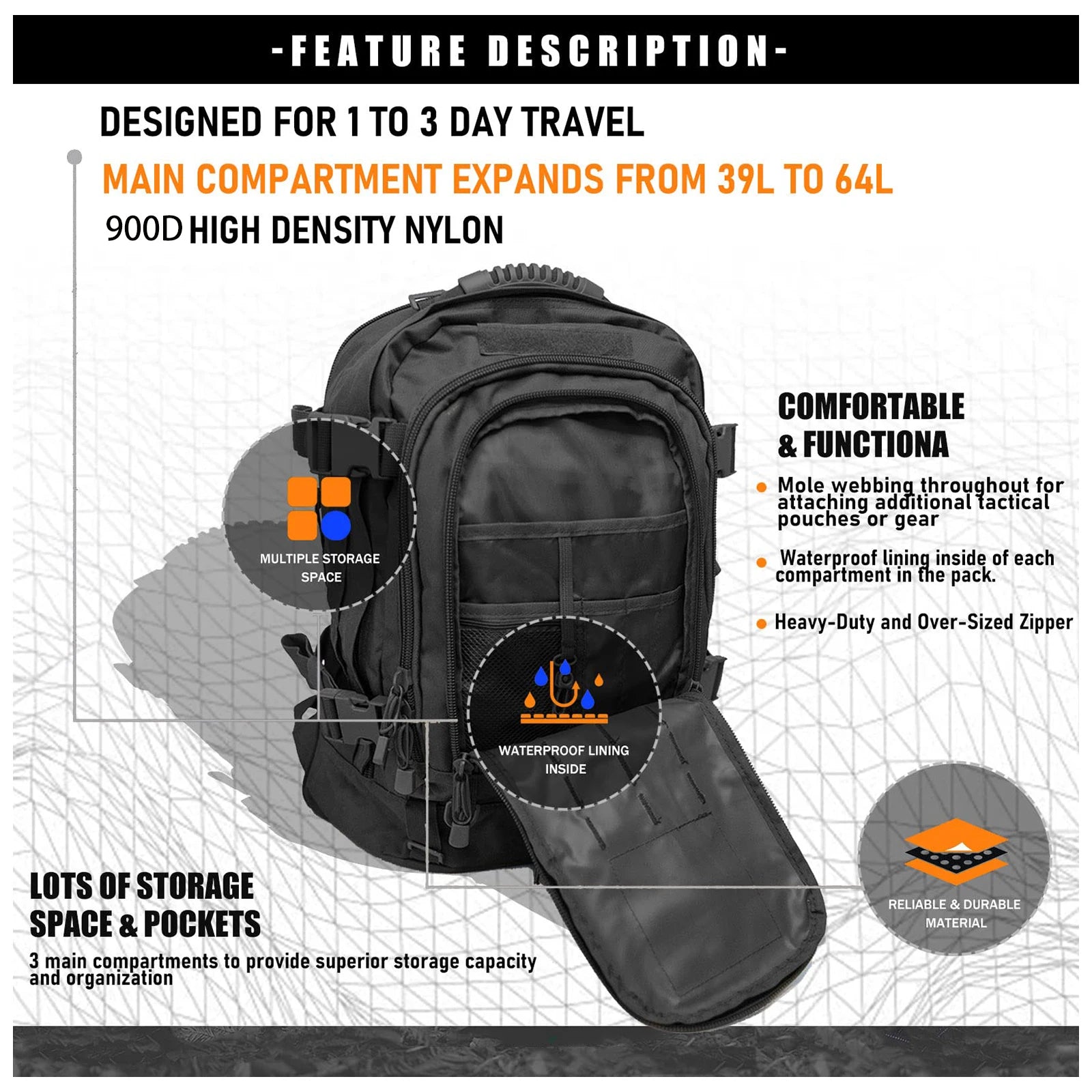 Don’t miss out on a rugged, adaptable pack that grows with your adventures. This large 55-60L tactical backpack expands to 64L, offers modular organization with MOLLE, and delivers reliable water resistance and comfort for any mission. Add to cart now and elevate your camping, hiking, travel, or daily carry with a backpack built to perform when it matters most.