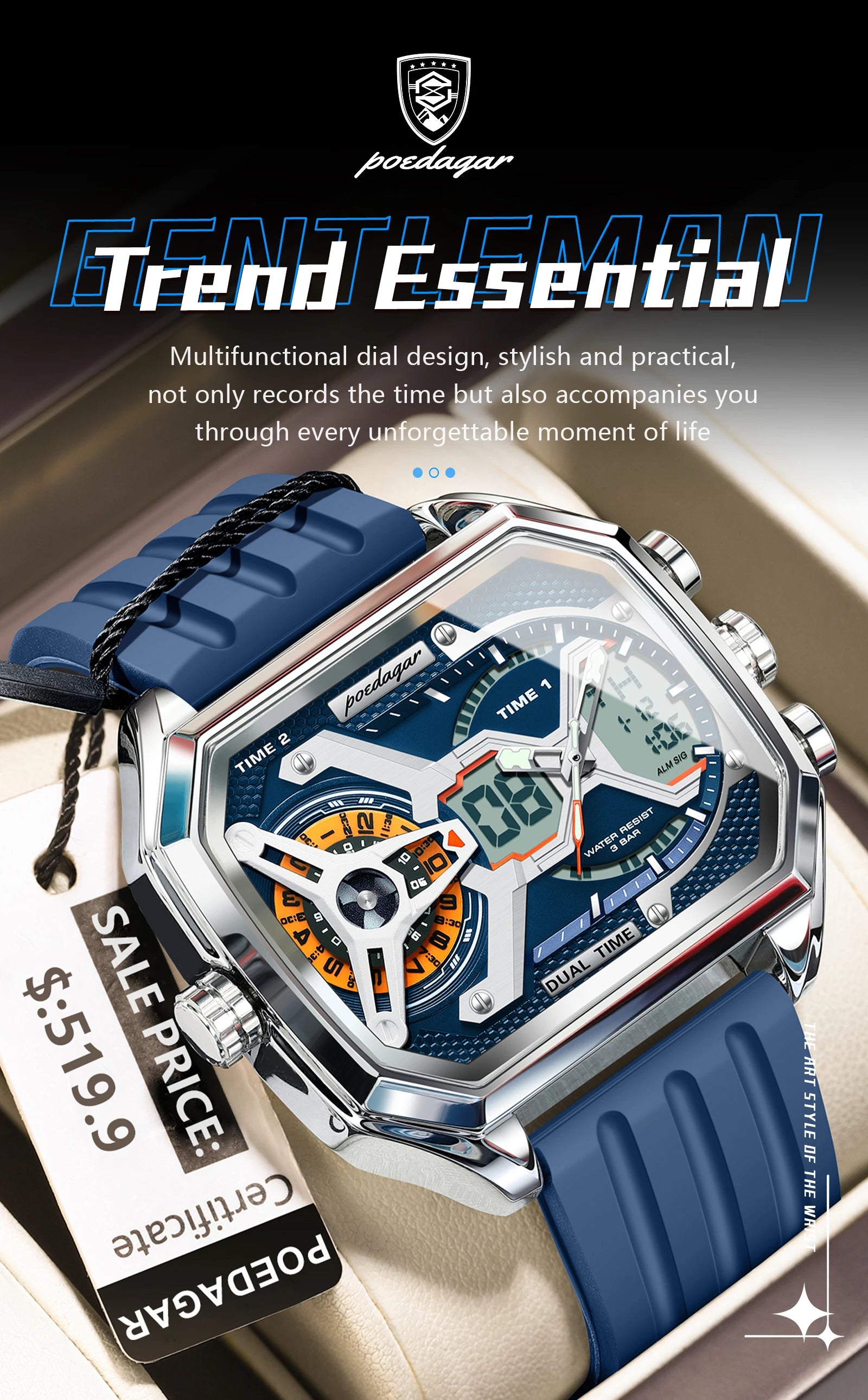 Introducing the POEDAGAR Top Luxury Men Clock LED Calendar Week Luminous Man Wristwatch, the perfect blend of style and functionality for the modern man. This electronic rectangle watch is designed to not just keep time, but to elevate your everyday look. With its luminous display and sleek silicone strap, it offers unmatched performance benefits including precise quartz movement and a lightweight feel that ensures comfort throughout the day. Whether you're at a business meeting or enjoying a casual outing, this watch will make a statement.