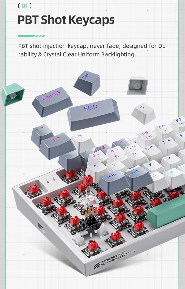 - PBT double-shot keycaps for durability, shine resistance, and crystal-clear backlighting