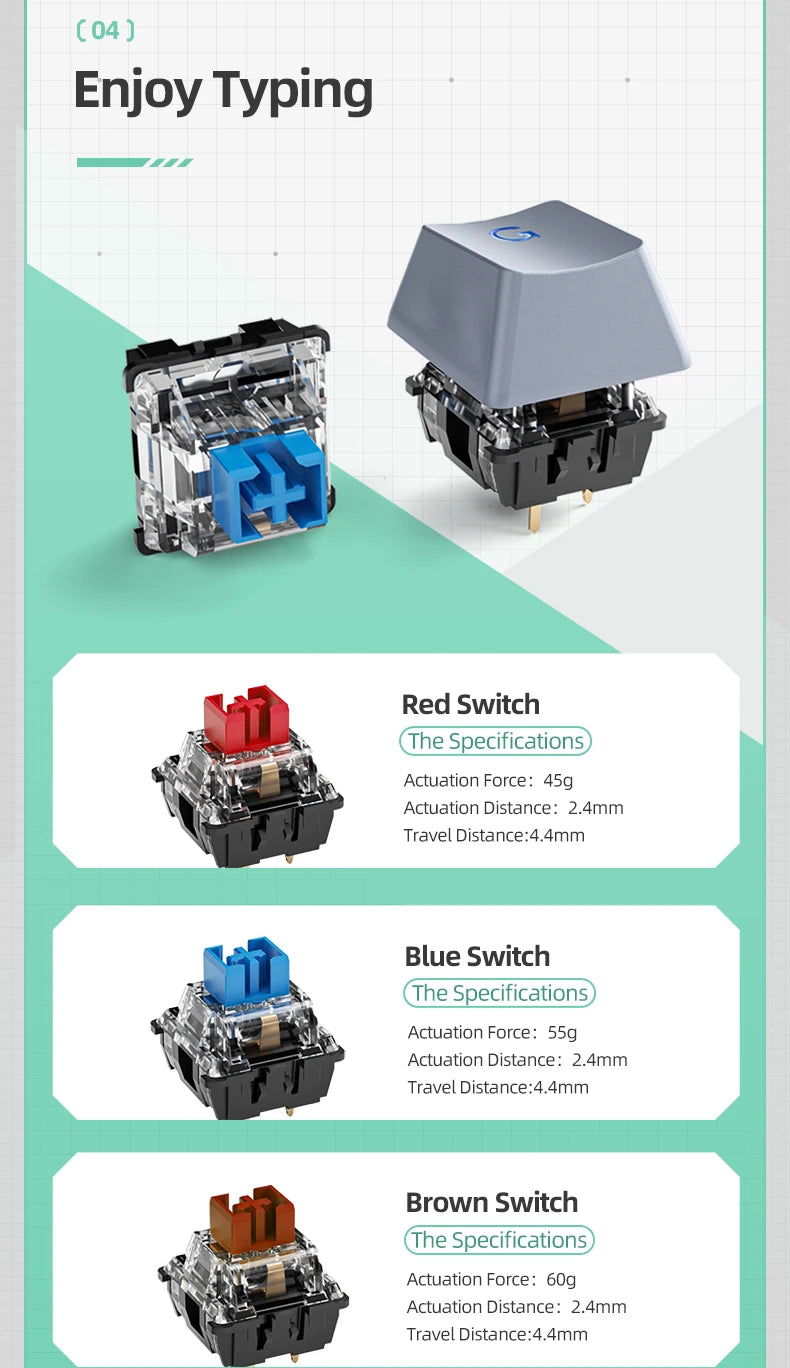 - Switch options: 3 Huano types available (Blue, Brown, Red) to match your preferred feedback