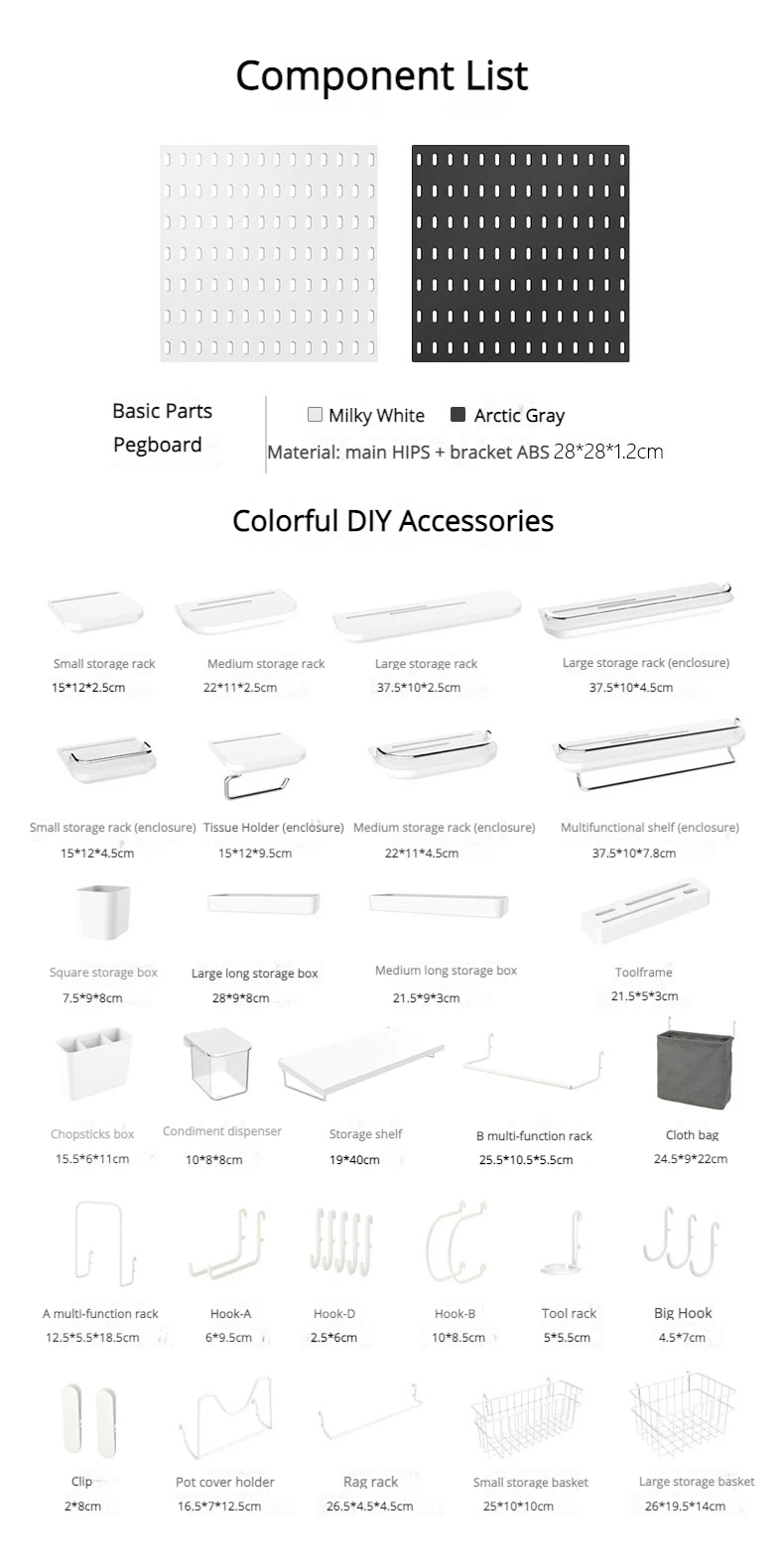 *Model: Pegboard,Storage box,Storage rack,Storage rack with enclosure,Multi-functional storage rack,Toolframe,Condiment dispenser,Tissue box,Multi-function hook,Cleaning cloth rack,Storage basket,Clip,Flower pot,Cup holder,etc. For more information,see item options in the main picture.