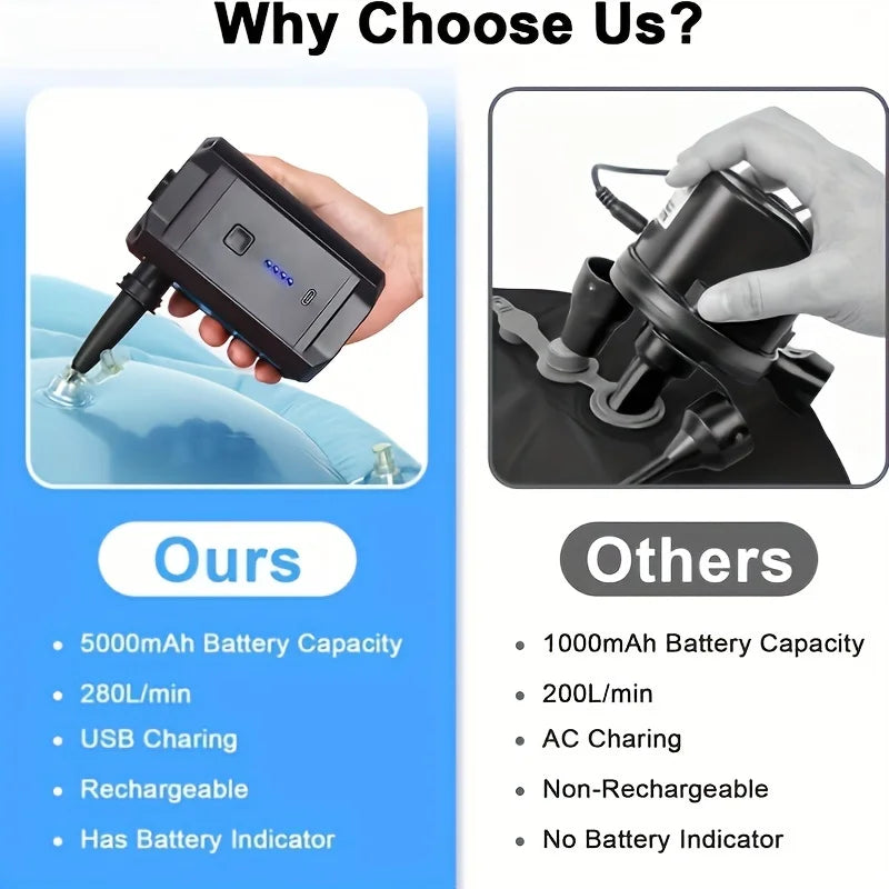 Meet the Portable Battery Powered Air Pump for inflatables outdoors — a compact, cordless solution designed to deliver fast, reliable airflow for pool floats, air mattresses, inflatable toys, and camping gear. Its battery-powered design eliminates cords and outlets, so you can inflate anywhere from beach days to campsite corners. Built for durability and safety, this pump balances power with portability, helping you spend less time pumping and more time enjoying the outdoors.