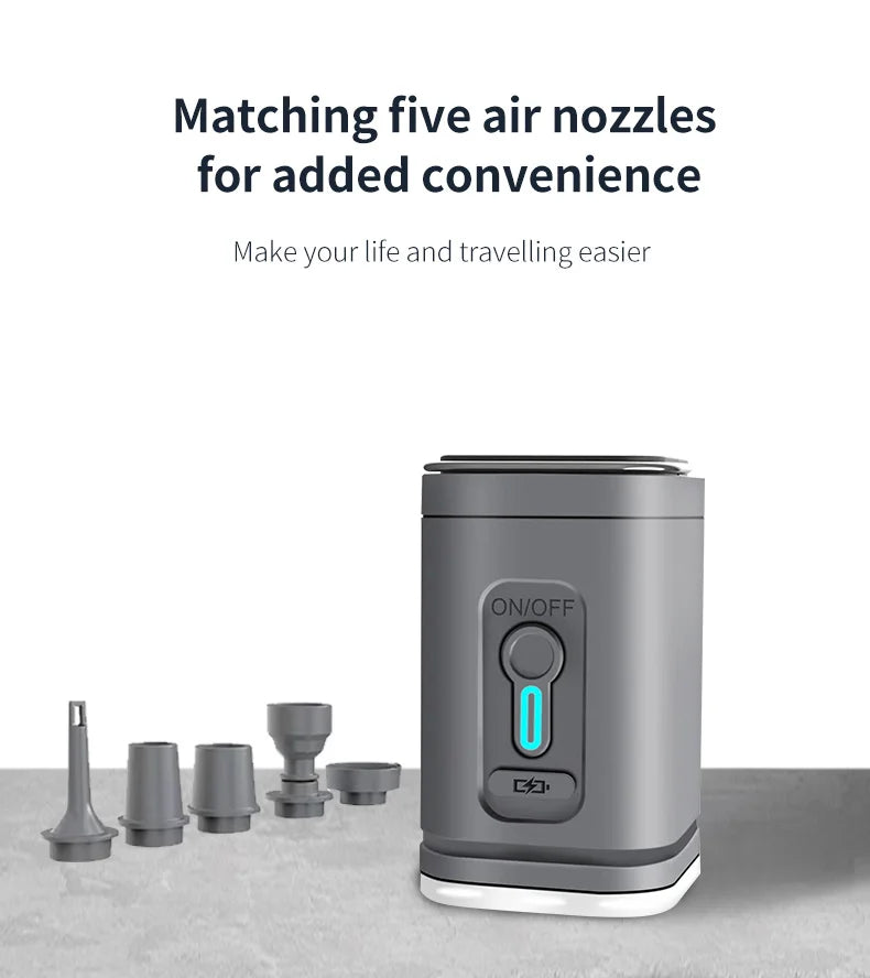 Discover a portable wireless air pump inflator for inflatables that combines speed, versatility, and convenience. Designed to deliver strong airflow with a powerful motor, it can inflate and deflate a wide range of inflatables quickly, saving time and effort. The USB-powered device is lightweight and compact, so you can move from poolside to campsite without dragging bulky equipment. Built-in LED lighting offers practical illumination for nighttime setups, while 5 removable nozzles ensure compatibility with most valves. Whether you’re inflating balloons, pool floats, air mattresses, inflatable furniture, swim rings, or toy boats, this pump is a reliable companion for home, travel, and outdoor adventures.