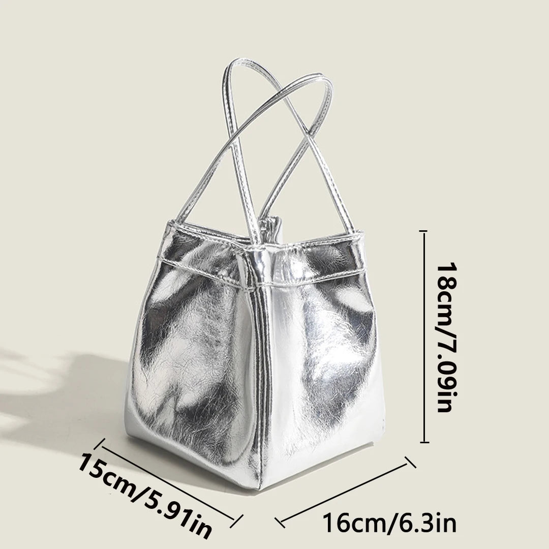 Silvery PU Bucket Bag For Women Lunch Box Style Small