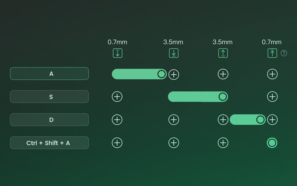 Dynamic Keystrokes (DKS) Pressing a key can trigger four different key operations. Depending on your keypress force: a light press triggers action 1, a deeper press activates action 2, and releasing the key also supports a two-stage key setting. |