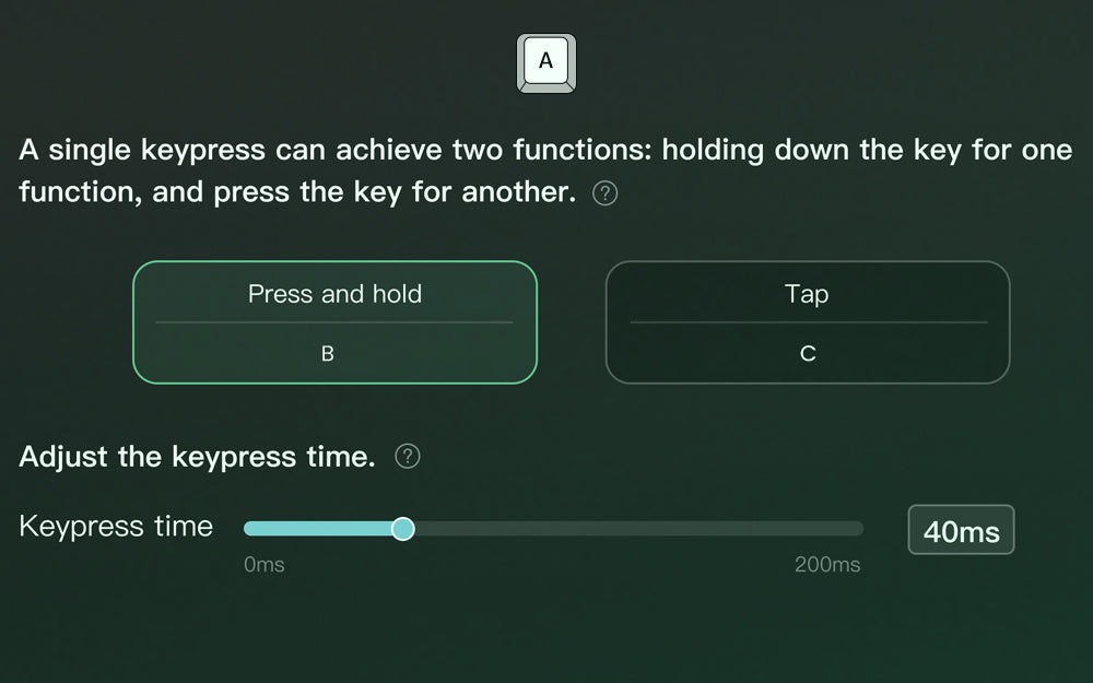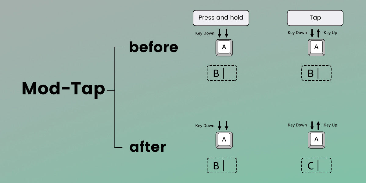Mod-Tap Mod Tap is a design that provides convenience for gaming. It enables the creation of dedicated or dual-functional keys based on key press behavior. A single keypress can achieve two functions: holding down the key for one function, and press the key for another. |