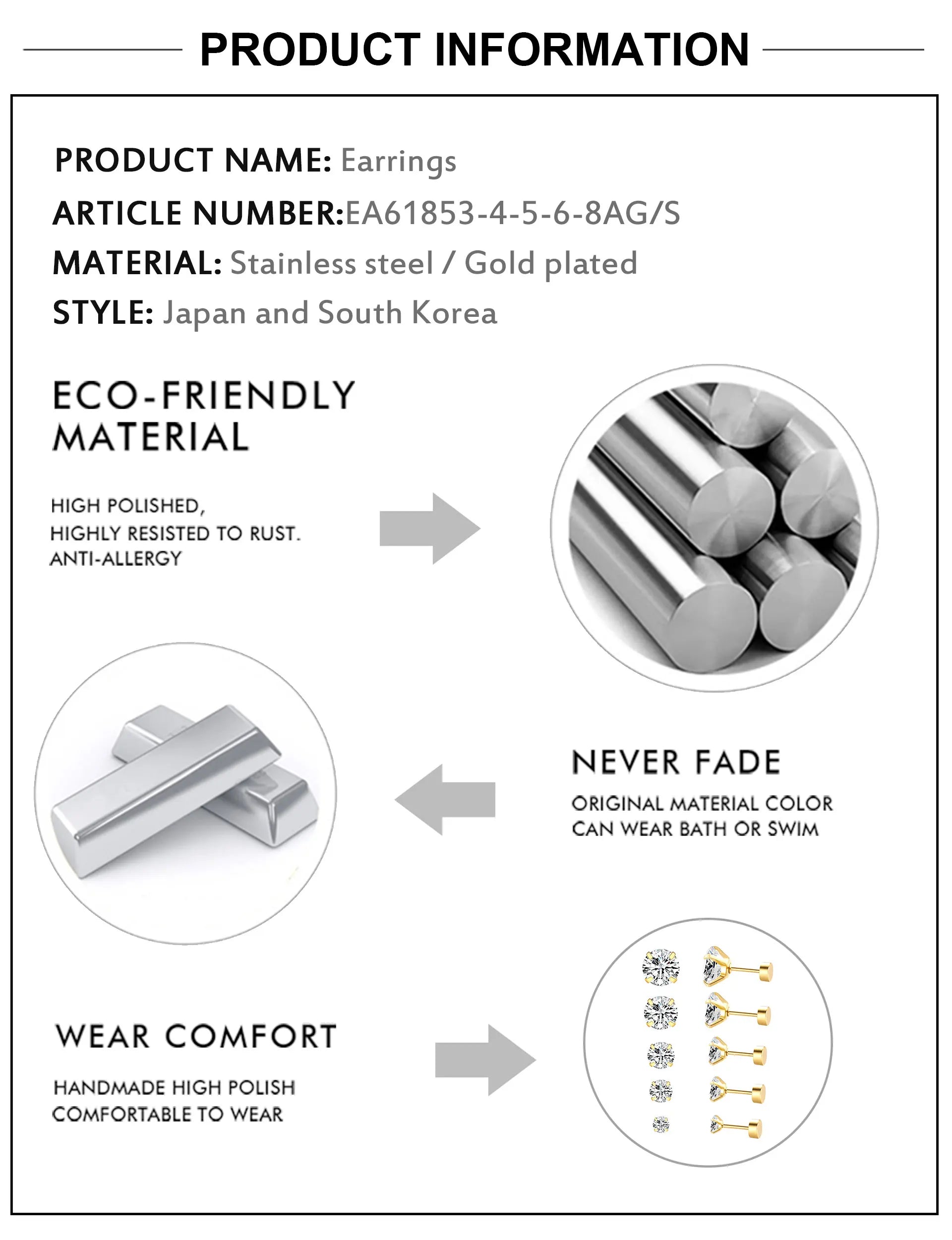 Stainless Steel Cubic Zirconia Stud Earrings Screw Back