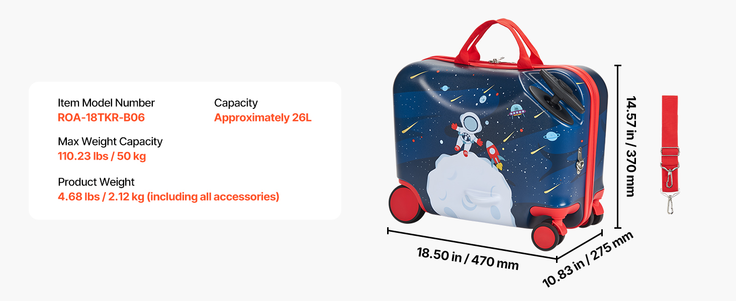 Compact Travel Companion: Measuring 18.50 x 10.83 x 14.57 inches, this children's ride-on suitcase meets airline carry-on size requirements, fits neatly in high-speed train seats, and car trunks, making your journeys more convenient and stress-free