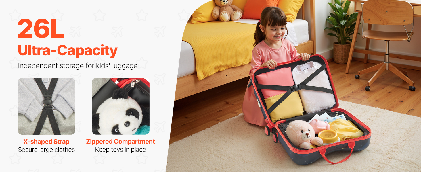 Efficient Storage: Offering a 26L capacity, this children's ride-on suitcase accommodates 2-3 sets of clothing, cups, snacks, and other essentials. The interior features X-straps and zippered compartments to help parents keep items neatly arranged and within easy reach during travel