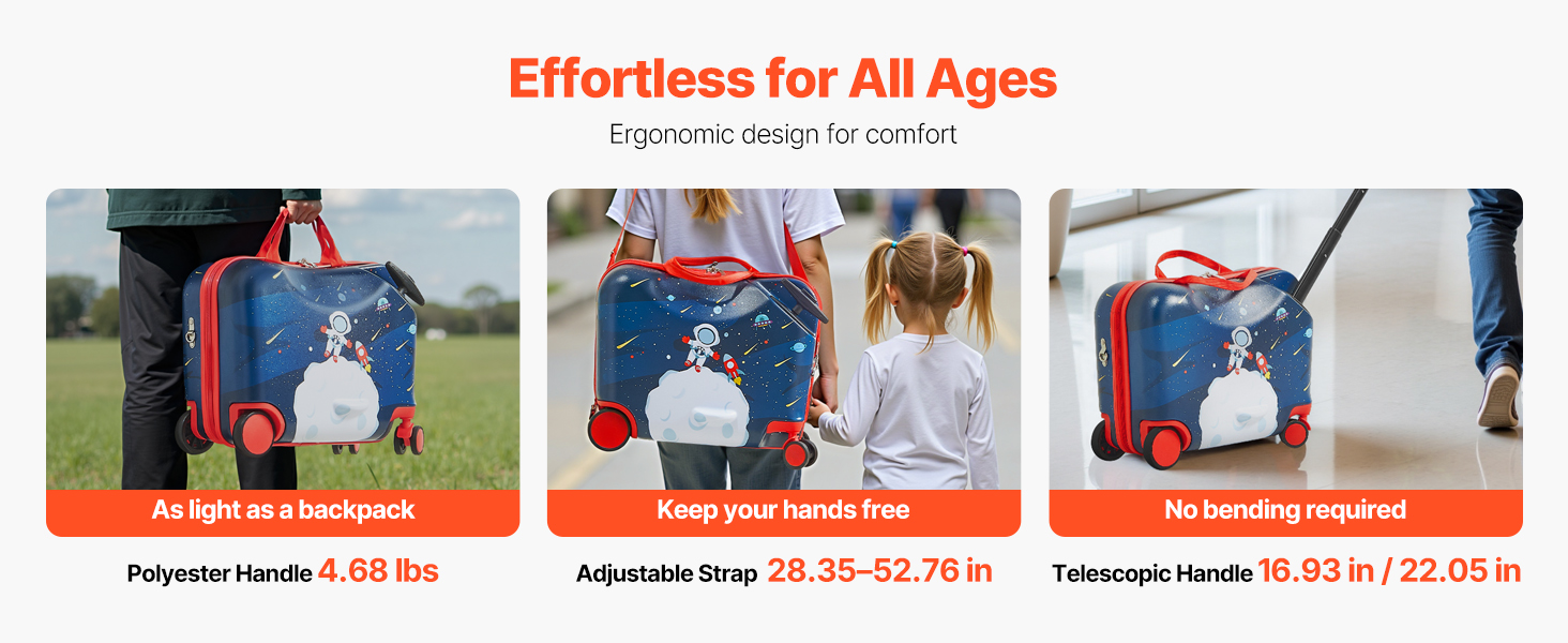 Effortless Navigation: Equipped with 2.21-inch front swivel wheels, this ride-on suitcase ensures seamless steering, while the 3.47-inch rear wheels enhance stability. The combination of TPR and PP materials minimizes vibrations and impacts, delivering a smooth and comfortable riding experience for your child