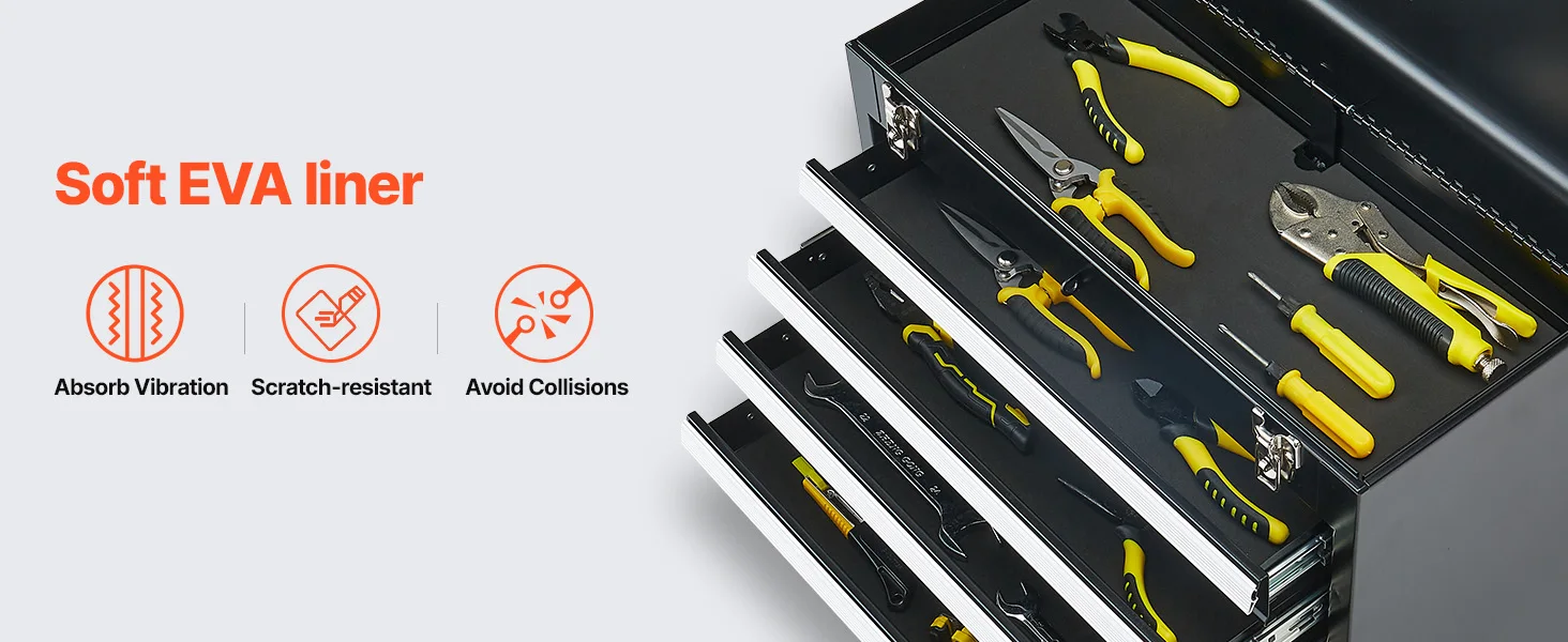 Smooth Operation for Easy Access: Opening the meta tool box becomes a smooth, effortless action with the well-designed hinge and tight-fitting lid providing splash protection. Each drawer is equipped with dual ball-bearing tracks for smooth, stable sliding, making it easy to pull out without worrying about getting stuck. The built-in EVA padding absorbs vibrations and avoids scratching or collisions, keeping everything secure and quiet.