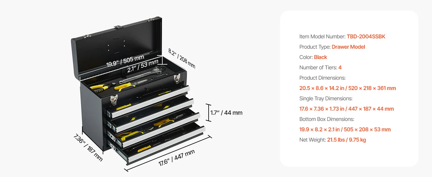 Ample Storage Space: The portable metal tool box measures 20.5 x 8.6 x 14.2 inches and weighs 21.5 lbs, making it ideal for carrying tools while working on the go or storing them in your vehicle's trunk. It features 1 top box (19.9 x 8.2 x 2.1 inches) and 3 drawers (17.6 x 7.36 x 1.73 inches), with each layer supporting up to 15 lbs, providing plenty of storage space.