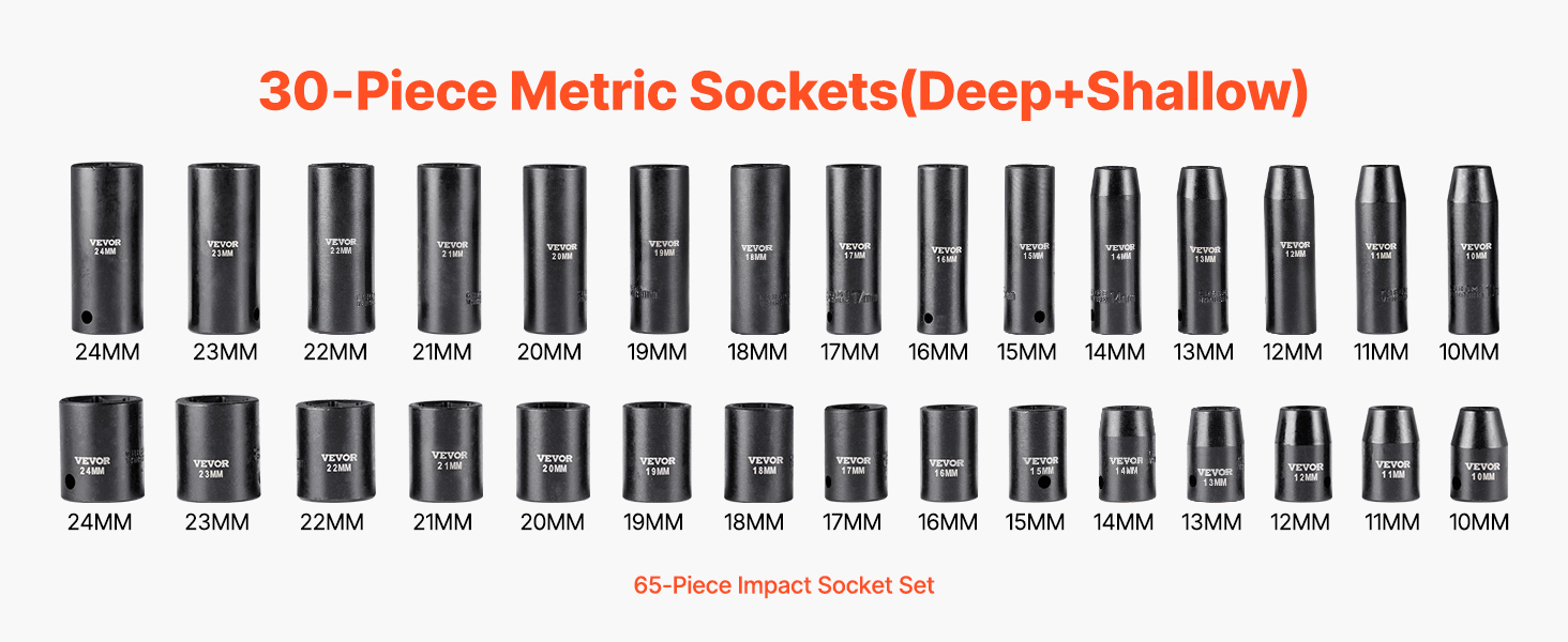 26-Piece Impact Socket Set: Includes 26 piece deep metric sockets: 10mm, 11mm, 12mm, 13mm, 14mm, 15mm, 16mm, 17mm, 18mm, 19mm, 20mm, 21mm, 22mm, 23mm, 24mm, 25mm, 26mm, 27mm, 28mm, 29mm, 30mm, 32mm, 33mm, 34mm, 35mm, 36mm