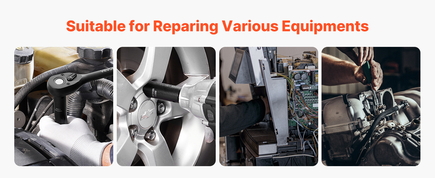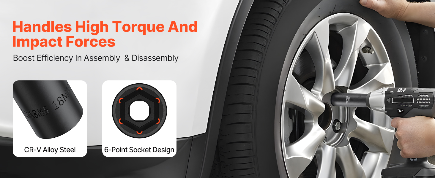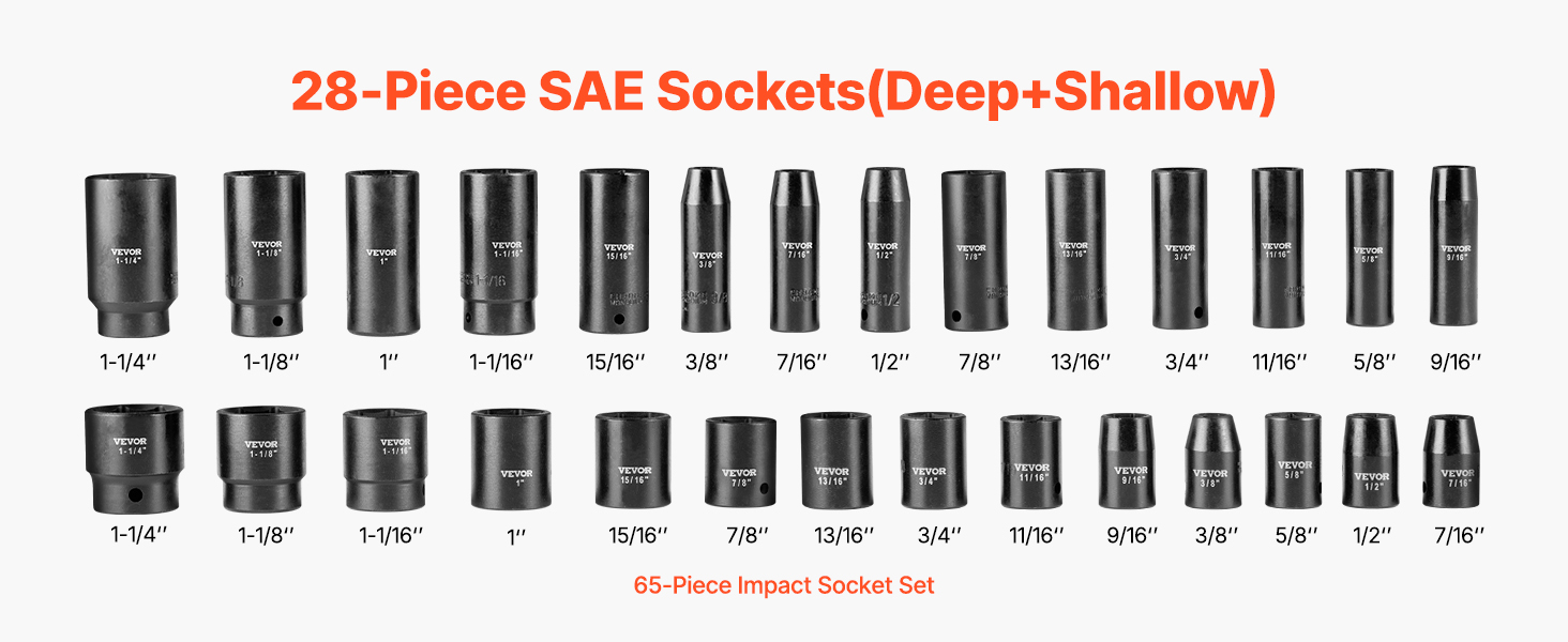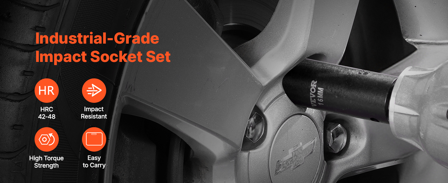 Rugged Construction: VEVOR 1/2 inches drive impact socket set is made from CR-V and Cr-Mo industrial-grade alloy steel, heat-treated with an HRC 42-48 hardness for superior impact resistance and high torque, ideal for heavy-duty mechanical tasks. (The 1-1/4" socket is Cr-Mo steel, and the 1/2" ratchet wrench is made of Cr-Mo + 40Cr steel)