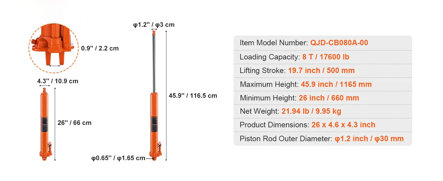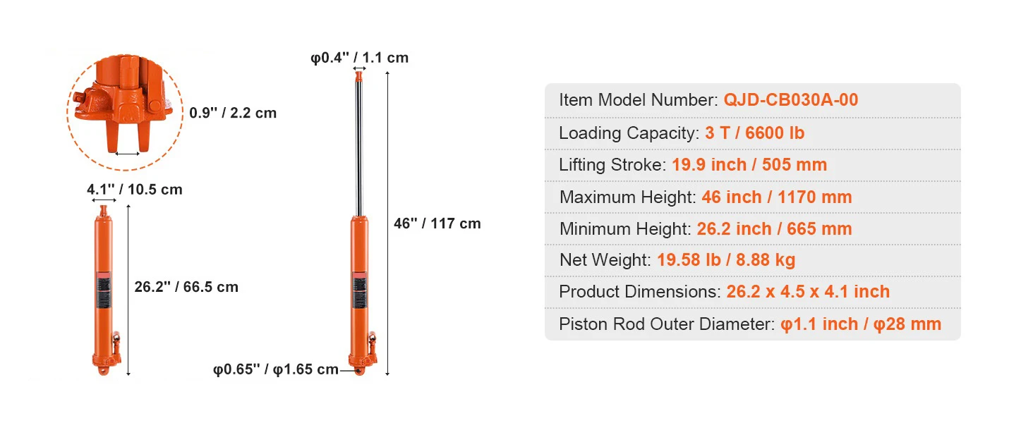 3-Ton Load Capacity & Adjustable Height: With a robust 3-ton/6600 lb load capacity and an adjustable height range from 26.2" to 46" (665-1170 mm), this hydraulic long ram jack effortlessly lifts heavy loads. And its slow-release function allows you to control your lifting tasks safely.