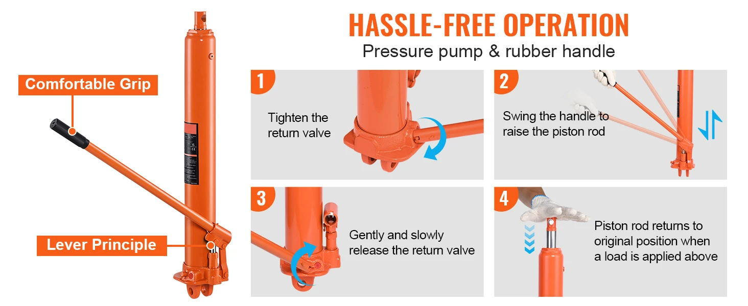 Effortless Lifting: The engine hoist cylinder is engineered for ease of use, requiring minimal physical effort even for heavy loads. The handlebar design enhances user convenience, and the comfortable rubber grip handle simplifies the lifting process.