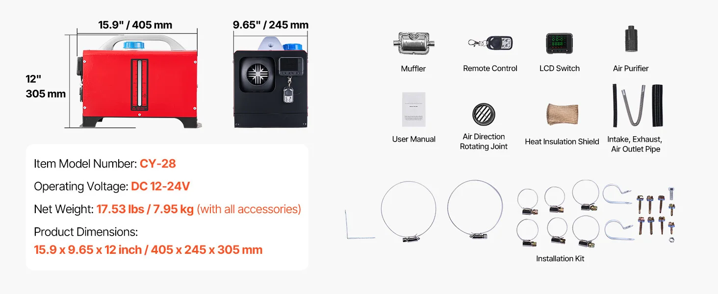 Efficient Heating: This 8kW diesel heater operates on DC 12V-24V, suitable for areas ranging from 161-215 FT². The ceramic igniter ensures quick starts in cold weather, raising the temperature in your vehicle, RV, boat, and more