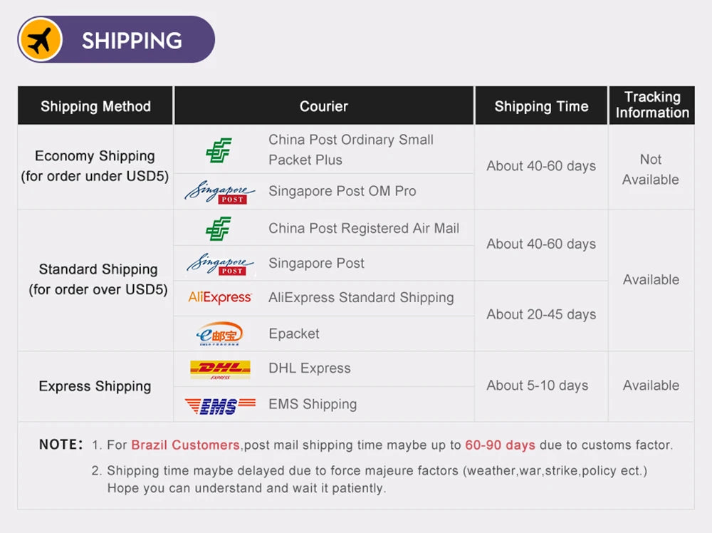 To keep the cost of our products low and pass the savings on to you, we ship a majority of our products directly from our warehouses located in USA, China, Germany, Russian Federation and European. Under usual circumstances, total delivery time is 9-21 days depending on your location (excluding processing times).