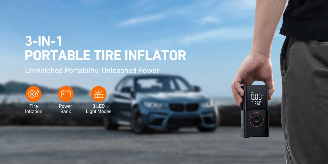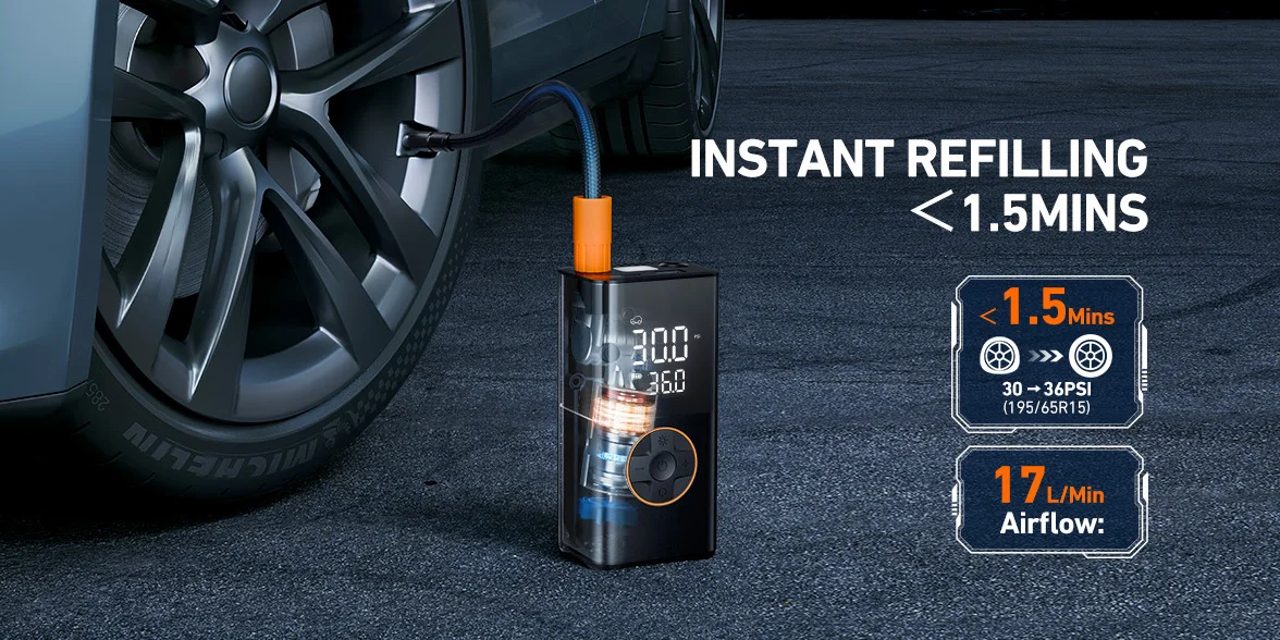 【Long Lasting Battery】: Our portable tire inflator for car has a built-in large-capacity rechargeable battery, With just one full charge, you can inflate four car tires (29-36 psi). This cordless air compressor for car tires is a great solution for emergencies on the way