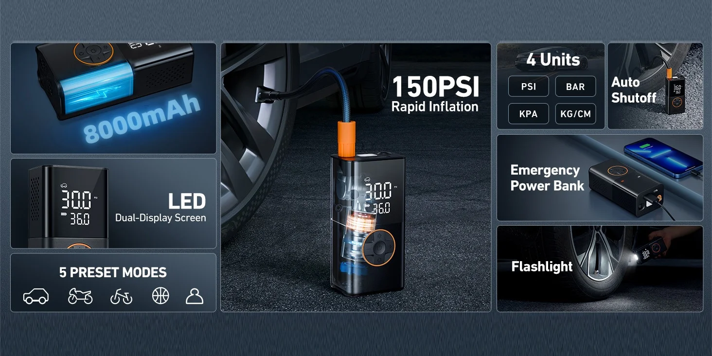 【5X Faster Tire Inflation】: Up to 150 PSI, this powerful smart air compressors has a built-in high-performance chip. Elevate tire pressure from 30 to 35 PSI in just 50 seconds or fully inflate car tires (0-36 PSI) in just 5 minutes. The large LED display shows real-time pressure values and the preset pressure at just a glance