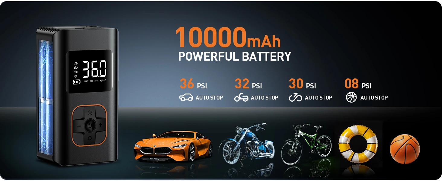 【5 Smart Modes & Auto Shut Off】:It offers 4 preset inflation modes (bicycles, motorcycles, cars, and balls). Once the preset pressure value is reached, the air pump automatically stops. The fifth custom mode allows you to set pressure values based on the inflation object to meet various inflation needs