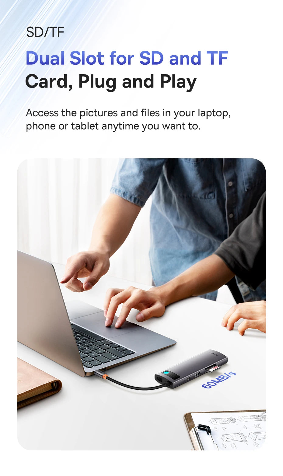 - Port Count & Configuration: 8-port expansion including HDMI, USB 3.0 x3, USB-C PD, RJ45, SD, and TF in a single hub.