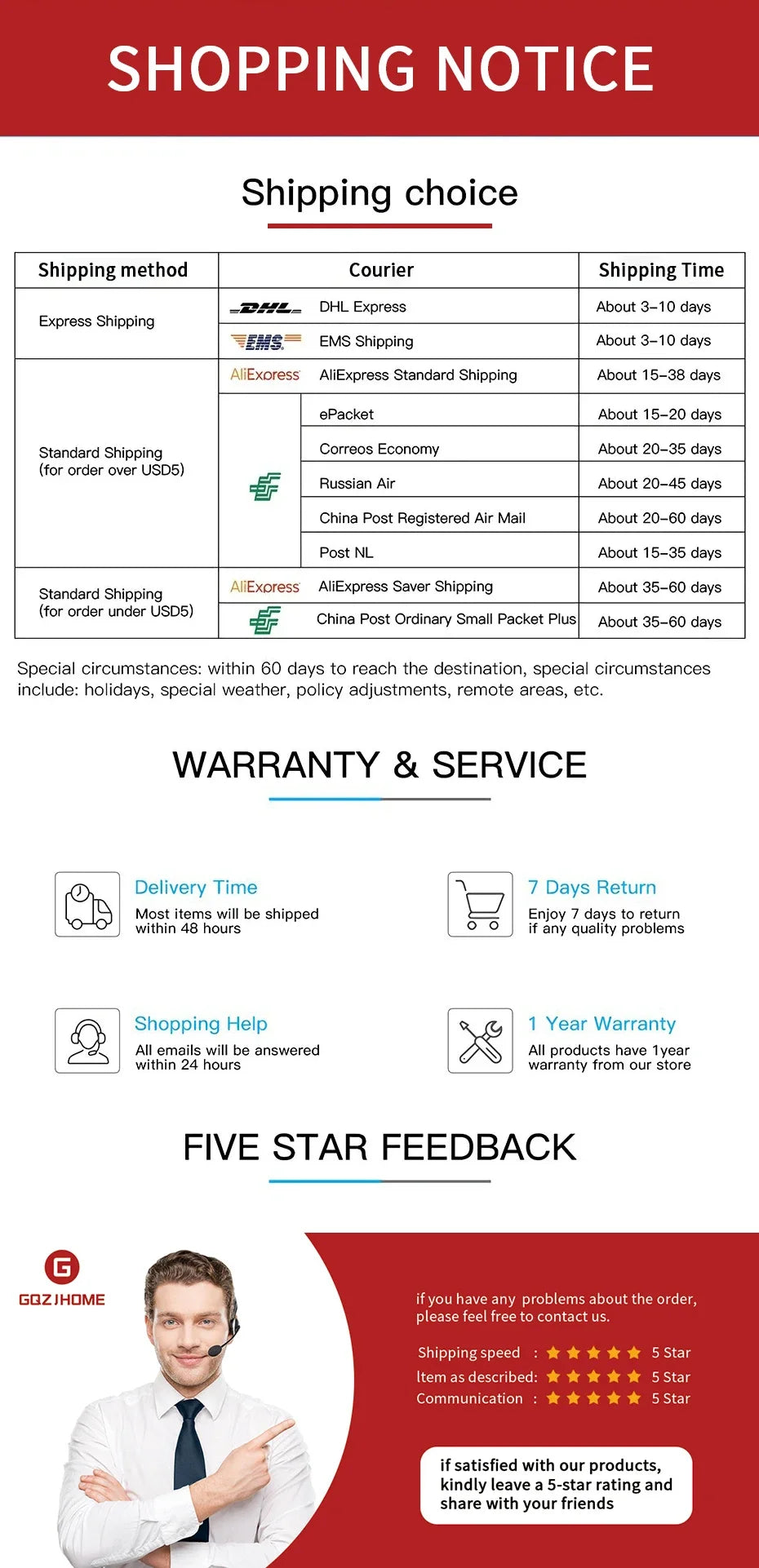 To keep the cost of our products low and pass the savings on to you, we ship a majority of our products directly from our warehouses located in USA, China, Germany, Russian Federation and European. Under usual circumstances, total delivery time is 9-21 days depending on your location (excluding processing times).