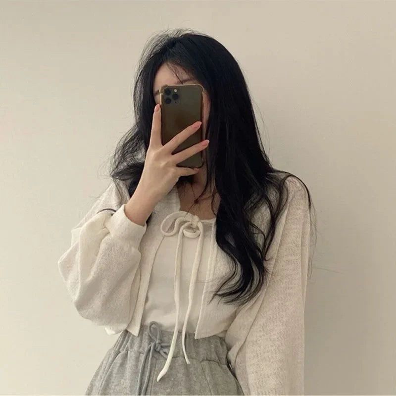 White Knitted Cardigan For Women Lace Up Summer Lightweight