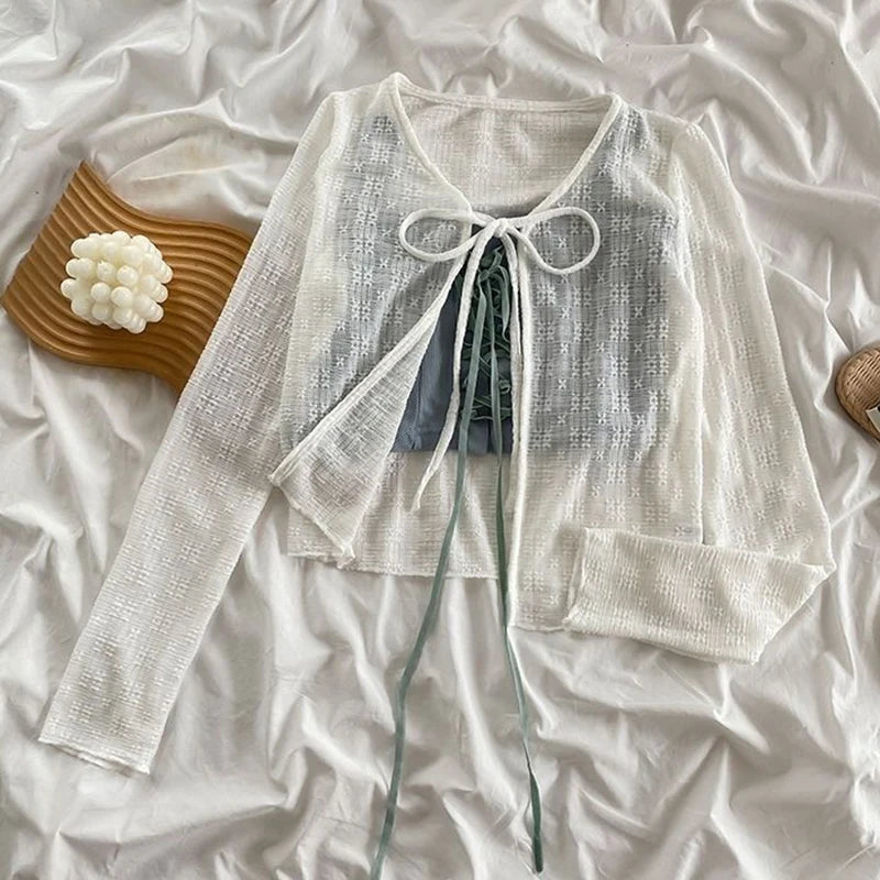 White Tie Up Summer Cardigan Women Long Sleeve Sheer Mesh