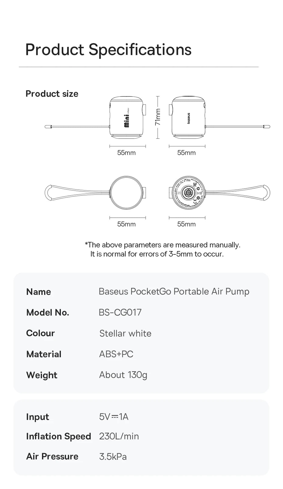 Key performance metrics highlight its efficiency: a steady 3.5 kPa air pressure paired with a high-speed 230 L/min airflow enables rapid setup, with a standard camping air mattress fully inflating in about 60 seconds. The 4-nozzle configuration ensures compatibility across gear types, from sleeping pads to inflatable pillows, reducing the need for multiple tools. The 3 lighting modes provide night-time operation without glare, while the palm-sized 130 g form-factor enhances portability for backpackers and day-trippers. The durable ABS+PC construction supports frequent outdoor use, and the 5V/1A input keeps power requirements simple and accessible via common USB sources. These data points together illustrate a device designed to deliver fast, reliable inflation and convenient deflation in a compact, rugged package.