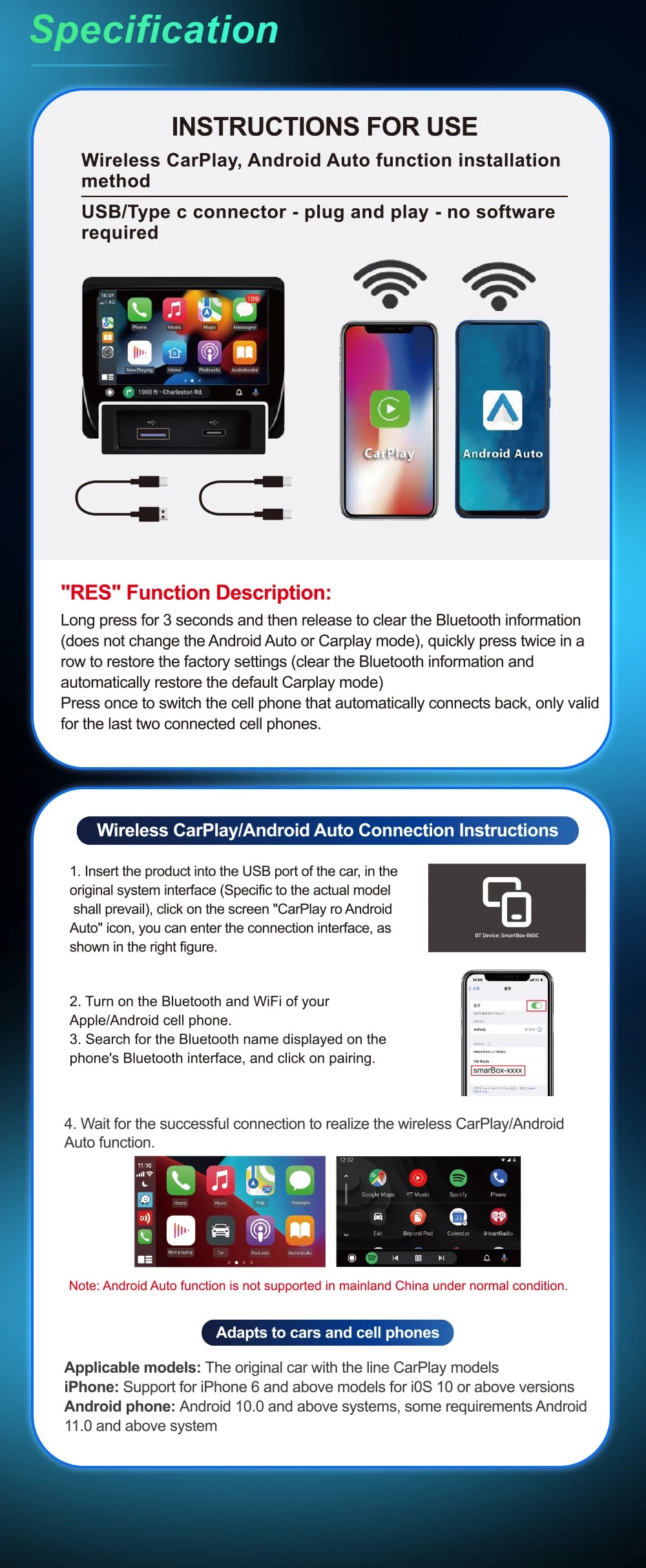 - 2-in-1 Functionality: Wired CarPlay + Android Auto to Wireless CarPlay + Android Auto