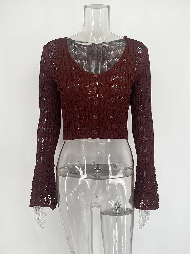 Womens Hollow Knitted Cardigan Long Sleeve V Neck Top